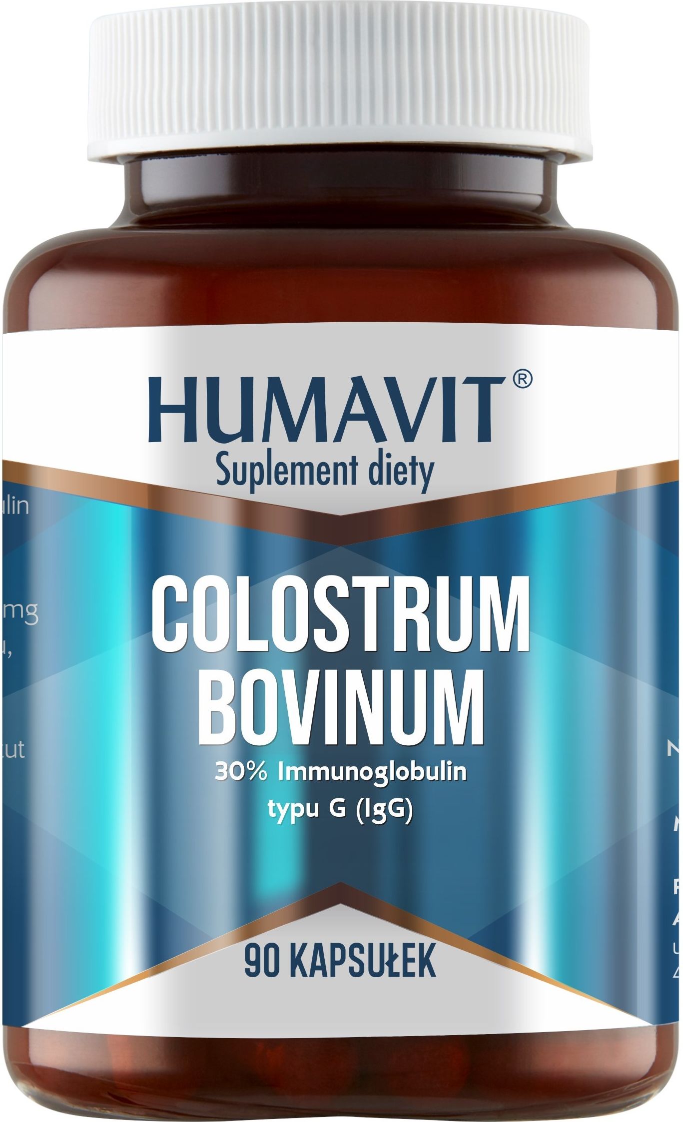 HUMAVIT® COLOSTRUM BOVINUM (SIARA BYDLĘCA) – 90 kapsułek Podstawowym składnikiem suplementu jest colostrum bovinum, czyli siara bydlęca, która zawiera wiele substancji mających korzystny wpływ na zdrowie człowieka (m.in. bogactwo witamin z grupy B oraz witaminy A, D, E). Produkt zawiera wysoką zawartość  immunoglobulin (30% IgG w suchej masie). Informacja żywieniowa (dwie kapsułki): Colostrum Bovinum (siara bydlęca): 750 mg Składniki: Colostrum Bovinum: 30% Immunoglobulin typu G (IgG), zawartość w proteinach IgG: 42,85%, otoczka kapsułki: żelatyna Masa netto produktu: 42 g Ilość porcji w opakowaniu: 45 Wielkość porcji: 2 kapsułki Numer EAN: 5903129301087 Numer BLOZ: 3974761 Zalecane spożycie: 1 kapsułka 2 razy dziennie podczas posiłku lub dwie kapsułki po posiłku, popić dużą ilością wody (200 ml do 250ml). Uwagi Zaleca się ostrożne podawanie produktu przy podejrzeniu alergii na białka mleka. Nie zaleca się stosowanie produktu dla osób po przeszczepach przyjmujących immunosupresanty. Suplement diety jest środkiem spożywczym, którego celem jest uzupełnienie normalnej diety. Suplement diety nie ma właściwości leczniczych. Suplement diety nie może być stosowany jako substytut (zamiennik) zróżnicowanej diety. Zrównoważony sposób żywienia i zdrowy tryb życia są istotne. Przechowywać w suchym miejscu, w temperaturze pokojowej, w sposób niedostępny dla małych dzieci. Producent i podmiot odpowiedzialny:  GOLDSTUDIO Adam Rudziński ul. Żwirki i Wigury 56B, 43-190 Mikołów NIP: 969 139 67 83 www.humavit.pl | biuro@humavit.pl