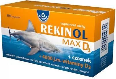 Preparat polecany w celu uzupełniania diety w składniki wspomagające pracę układu odpornościowego. Polecany jest szczególnie w okresie jesienno-zimowym oraz w okresie przesilenia wiosennego. Składniki: Rafinowany olej z wątroby rekina standaryzowany na 20% zawartość alkilogliceroli, żelatyna (składnik otoczki), rafinowany macerat olejowy z czosnku (Allium sativum) standaryzowany na 2% zawartość alliiny, substancja utrzymująca wilgoć: glicerol, cholekalcyferol. Dzienna porcja (1 kapsułka) zawiera: olej z wątroby rekina – 900 mg , w tym: alkiloglicerole – 180 mg macerat olejowy z czosnku – 100 mg, w tym: alliina – 2 mg witamina D3 – 100 µg (4000 j.m. – 2000% RWS). Masa netto: 60 kapsułek Właściwości: Suplement diety Rekinol MAX D3 zawiera olej z wątroby rekina standaryzowany na 20% zawartość alkilogliceroli, witaminę D3 oraz standaryzowany na zawartość alliiny macerat olejowy z czosnku. Zawartość składników jest dwukrotnie większa w porównaniu do produktu Rekinol Ekstra D3. Witamina D pomaga w prawidłowym funkcjonowaniu mięśni i układu odpornościowego, a także bierze udział w procesie podziału komórek. Ponadto, pomaga w utrzymaniu zdrowych kości oraz zębów. Z kolei czosnek przyczynia się do prawidłowego funkcjonowania układu odpornościowego oraz do prawidłowego funkcjonowania układu oddechowego. Zalecane dzienne spożycie: Dorośli – 1 kapsułka dziennie na pół godziny przed posiłkiem. Przeciwwskazania: Nadwrażliwość na którykolwiek ze składników preparatu. W okresie ciąży i karmienia piersią przed zastosowaniem należy skonsultować się z lekarzem lub farmaceutą. Przechowywanie: Przechowywać w suchym miejscu. Chronić przed słońcem. Producent: Oleofarm Sp. z o.o., Mokronoska 8, 52-407 Wrocław