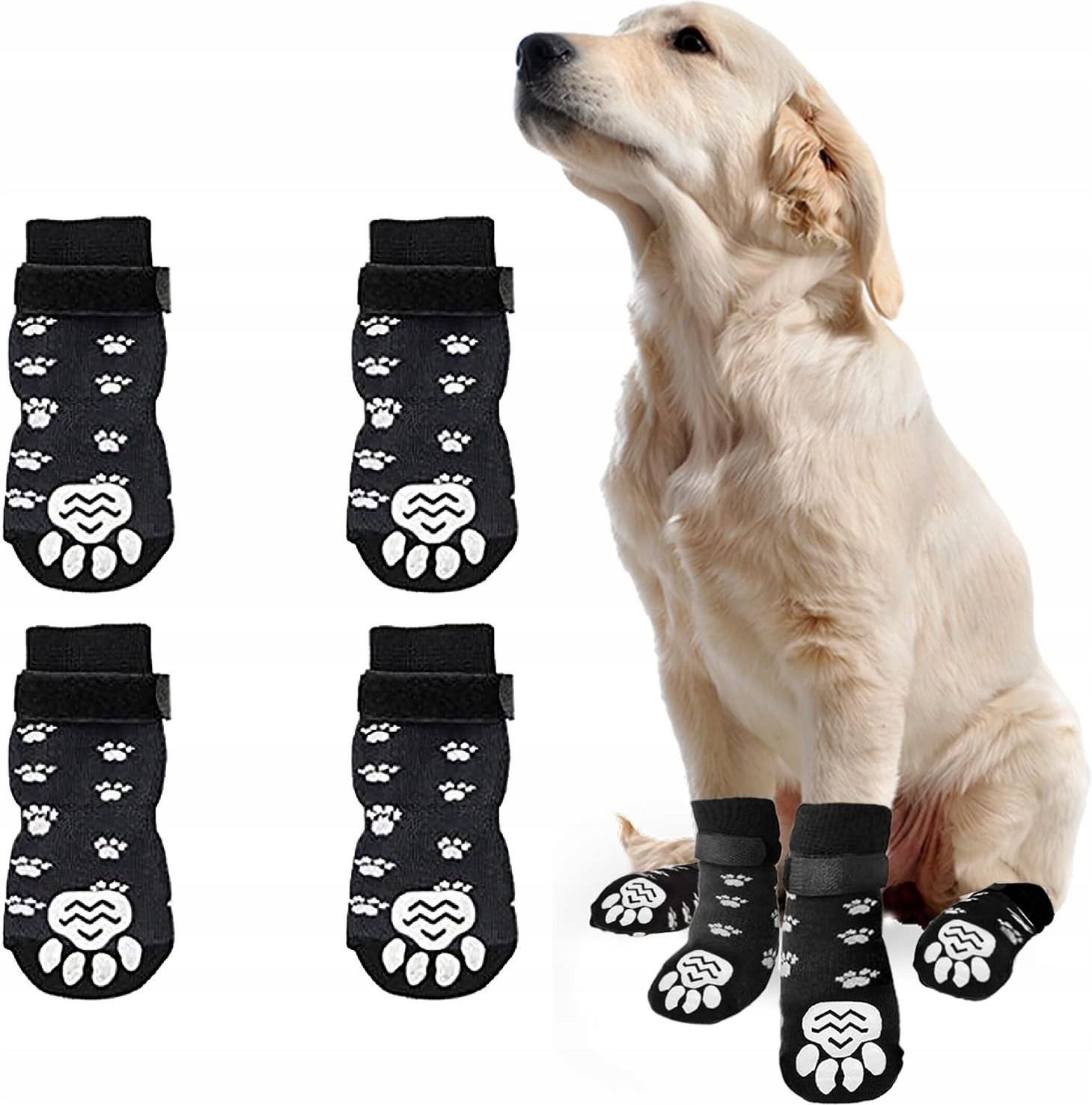 Skarpetki dla psa z rzepem. Rozm. L. Oferujemy skarpetki dla psa z rzepem ochronne, dostępne w rozmiarze L i kolorze czarnym. Skarpety zostały wykonane z wysokiej jakości materiałów, zapewniając trwałość i komfort dla Twojego pupila.Rzep ochronny umieszczony na skarpetkach zapewnia dopasowanie i trzymanie się łapki psa. Dzięki temu skarpety nie będą się przesuwać podczas spacerów czy aktywności na świeżym powietrzu. Dodatkowo, skarpety chronią łapki przed uszkodzeniami i zranieniami, zabezpieczając wrażliwe poduszeczki. Komfort dla Twojego czworonoga! Są idealne dla psów aktywnych, które często biegają, chodzą po twardych powierzchniach lub uczestniczą w treningach. Zapewniają one ochronę i komfort, niezależnie od warunków atmosferycznych. Wzór na skarpetkach dodaje stylowego wyglądu i sprawia, że Twój pies będzie wyglądał modnie podczas spacerów.Zapewnij swojemu psu pełną ochronę podczas każdej aktywności na zewnątrz. Wybierz skarpetki dla psa z rzepem ochronne już dziś! W skład kompletu wchodzą 4 sztuki skarpetek Rozmiarówka (+/- 0.5cm) L – Szerokość ściągacza; 6,75 cm; Długość skarpetki: 16 cm; M – Szerokość ściągacza; 6,25 cm; Długość skarpetki: 14,25 cm; S – Szerokość ściągacza; 4,5 cm; Długość skarpetki: 13 cm;