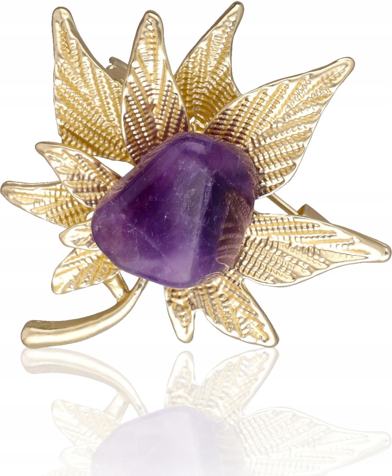 Broszka z kamieniem ametystem liść Modna broszka z kamieniem ametystem Ametyst fioletowy jest kamieniem naturalnym, co sprawia, że każda sztuka jest jedyna w swoim rodzaju. Ponadczasowy motyw liści to nie tylko estetyczny wybór, ale również wyraz szacunku do natury i jej piękna, co sprawia, że biżuteria ta jest ceniona przez wielu miłośników oryginalnych dodatków. Broszka z kamieniem może stać się osobistym amuletem, wykorzystującym właściwości naturalnego minerału. Broszki można nosić na wiele sposobów – przypięte do marynarki, płaszcza, szala, kapelusza czy torebki. Dzięki temu są niezwykle wszechstronne i mogą uzupełniać różnorodne stylizacje. Informacje Wymiary: około 3,5 x 3,5 cm Waga: około 11 g Kamień: ametyst, około 1-2 cm Kolor: złoty, odcienie fioletu Zapięcie: agrafka Motyw: roślinny, liście Cena dotyczy 1 sztuki wybranej losowo. Zdjęcia przedstawiają przykładowe broszki. Część metalowa jest sklejona z kamieniem. Mogą zdarzyć się widoczne ślady kleju. Na kamieniu mogą wystąpić drobne ryski, obkruszenia, inkluzje czy nierówności, co jest charakterystyczne przy szlifowaniu kamieni. Właściwości ametystu Ametyst od wieków kojarzy się z energią uspokajającą. To kamień, który pomaga wyciszyć emocje, łagodzi stres i promuje wewnętrzną harmonię. Ametyst symbolizuje wyższą duchowość, jasność umysłu i rozwój intuicji. Wierzono, że pomaga w medytacji i wspomaga kontakt z wyższymi poziomami świadomości, dlatego bywa nazywany "kamieniem duszy". W starożytnej Grecji ametyst był kojarzony z trzeźwością. Nazwa "ametyst" pochodzi od greckiego słowa "amethystos", które oznacza "niepijący". Wierzono, że noszenie ametystu chroni przed upijaniem się i sprzyja jasności umysłu, co przekłada się na współczesne wierzenia o jego właściwościach wspierających koncentrację i zdrowe myślenie. Ponadto, kamień ten jest ceniony za wspomaganie harmonii i równowagi emocjonalnej i radzenia sobie z trudnymi uczuciami, takimi jak gniew, żal czy smutek. Przypisuje mu się właściwości łagodzące, pomagające w radzeniu sobie z negatywnymi emocjami. Motyw liści w biżuterii Motyw liści w biżuterii to jeden z najbardziej popularnych i uniwersalnych wzorów, który odzwierciedla piękno natury i jej różnorodność. Inspiracje roślinne są obecne w wielu stylach biżuterii, od klasycznej po nowoczesną, i mają wiele zalet estetycznych oraz symbolicznych. Naturalna estetyka: Broszka z motywem liści przyciąga uwagę swoją organiczną formą i delikatnymi detalami. Symbolika: Liście symbolizują życie, wzrost i odrodzenie. W wielu kulturach są uważane za znak nadziei i pozytywnej energii. Noszenie biżuterii z tym motywem może być wyrazem osobistych przekonań lub związanych z naturą wartości. Uniwersalność: Motyw liści jest na tyle wszechstronny, że doskonale sprawdza się przy różnych okazjach.