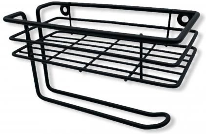 Praktyczny wieszak na ręczniki papierowe z półką na przyprawy, akcesoria kuchenne lub inne drobiazgi. Ze względu na swój uniwersalny rozmiar może również służyć jako uchwyt na papier toaletowy a półkę możemy wykorzystać np. do odłożenia smartfona. Materiał: metal malowany proszkowo na kolor czarny, Wymiary: długość 18 cm, szerokość 9 cm, wysokość 11,5 cm Prosty montaż (śruby i kołki w zestawie)