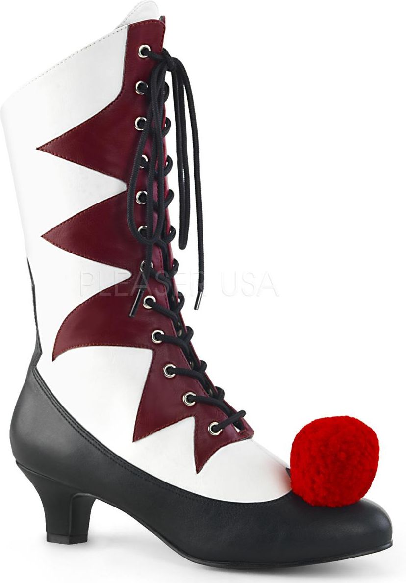 2 Kitten Heel Lace-Up Front Mid-Calf Boot, Side Zip 2 (5.1cm) Kitten Heel Lace-Up Front Mid-Calf Boot Featuring Clown Shoe Design w/ Cotton Puff on Toe, Inner Side Zip Closure