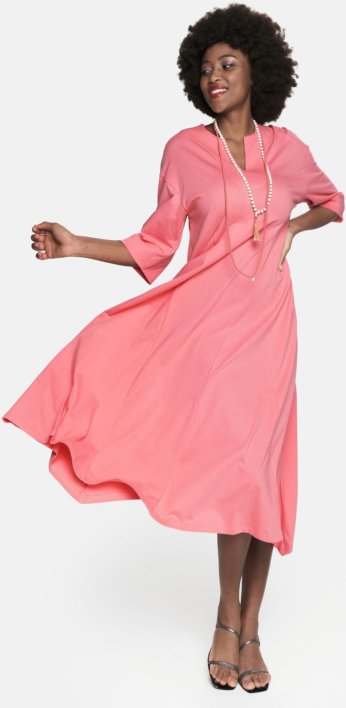 KOLOR: KORALOWY 25 Bawełna 100%. Cienka dzianina bawełniana. GRAMATURA: 150 G/M2 Luźna, bawełniana sukienka maxi o rozkloszowanym kroju. Delikatny dekolt z subtelnym wycięciem w szpic wysmukla szyję, a rękawy o długości do łokcia dodaje całości lekkości. Zaprojektowana i uszyta w Polsce. • długość maxi, • rękaw do łokcia, • lekko rozkloszowany krój, • kieszenie boczne, • modelka ma 176 cm wzrostu i nosi rozmiar M. WYMIARY (w centymetrach, mierzone na płasko): S: szerokość w biuście 46, długość rękawa 30, szerokość w biodrach 58, szerokość dołu 114, długość całkowita 118, M: szerokość w biuście 48, długość rękawa 31, szerokość w biodrach 60, szerokość dołu 120, długość całkowita 123, L: szerokość w biuście 52, długość rękawa 32, szerokość w biodrach 62, szerokość dołu 128, długość całkowita 131.