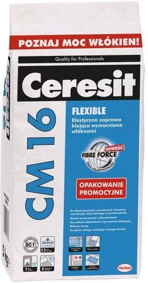 CM-16 zaprawa elastyczna FLEX 5kg; kod produktu: CM16/5 Ceresit CM 16 zaprawa elastyczna FLEX 5kg do gresu tarasów i ogrzewania Ceresit CM 16 to elastyczna zaprawa klejąca klasy S1 do płytek gresowych, ceramicznych, cementowych i kamiennych (z wyjątkiem marmuru). Przeznaczona do stosowania wewnątrz i na zewnątrz – idealna na trudne i odkształcalne podłoża, takie jak ogrzewanie podłogowe, płyty OSB, stare płytki czy tarasy. Zapewnia trwałość, wysoką przyczepność oraz doskonały rozpływ pod płytką. Właściwości produktu elastyczna formuła – klasa S1 wysoka przyczepność do trudnych podłoży na podłoża odkształcalne: tarasy, balkony, ogrzewanie podłogowe do wszystkich typów płytek: gres, ceramika, kamień, cement (oprócz marmuru) świetny rozpływ – pełne podparcie pod płytką do stosowania na izolacjach przeciwwilgociowych i przeciwwodnych do dużych i małych formatów płytek Dane techniczne opakowanie: 5 kg zastosowanie: wewnątrz i na zewnątrz podłoża: beton, jastrych, płyty OSB, gips, stare płytki, powłoki malarskie nasiąkliwość płytek: także < 3% (np. gres) alternatywa dla marmuru: Ceresit CM 15