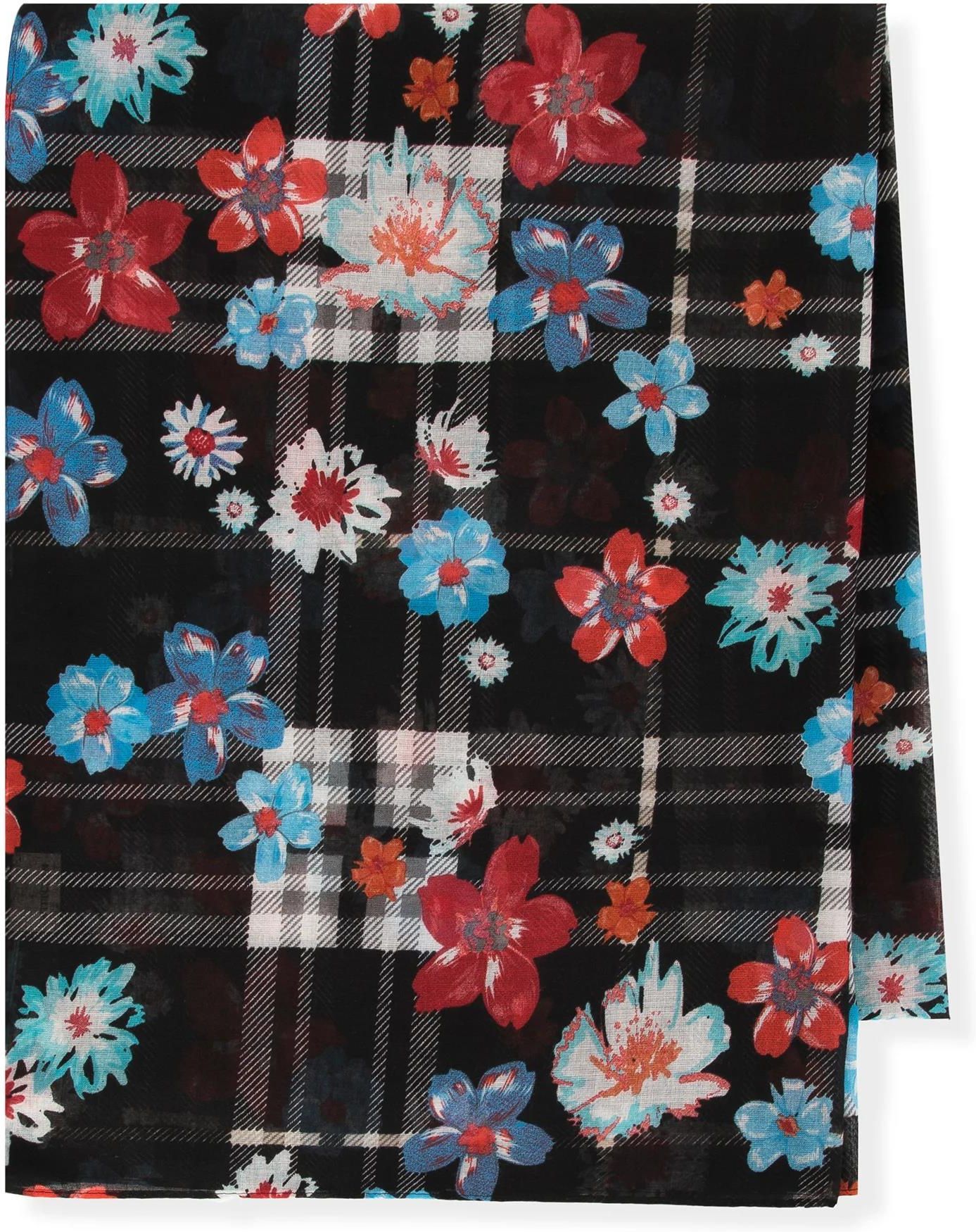 Cienki szal damski w kwiaty i kratę czarno - czerwony Żyrardów
