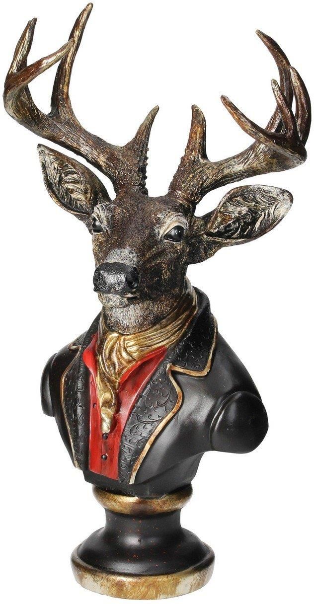 Dekoracja stojąca - popiersie jelenia we fraku.Ozdoba stojąca w formie popiersia jelenia w eleganckim fraku to wyjątkowa i stylowa dekoracja, która doda szyku i charakteru każdemu wnętrzu. To niezwykle efektowny element, który przyciąga uwagę i nada pomieszczeniu niepowtarzalny klimat. Ta oryginalna ozdoba jelenia we fraku to połączenie ekstrawagancji z elegancją. Jego imponujące rogi i majestatyczna postura symbolizują siłę i pewność siebie, frak natomiast dodaje mu subtelnej i wyrafinowanej elegancji. Kolorystyka i wykończenie detali są starannie dobrane, aby odzwierciedlić unikatowość i wyjątkowy charakter ozdoby.Popiersie jelenia we fraku może opowiadać historię lub dodać nutkę intrygującej tajemnicy do przestrzeni. To także trafiony pomysł na prezent dla miłośników oryginalnych dekoracji. Wymiary: szer. 30 cm, gł. 22 cm, wys. 58 cm.