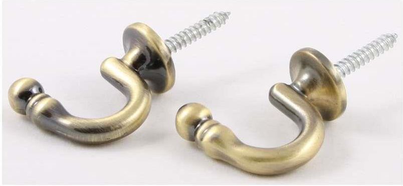 Haczyki do podwiązek 2szt. złoty antyk, komplet 2 sztuki Kod produktu: 836-867 Uniwersalne haczyki do zaczepienia podwiązek drapujących zasłony lub firany. Komplet 2 sztuki.