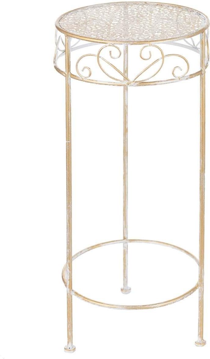 Metalowy kwietnik o ażurowym wykończeniu. Okrągły blat z finezyjnymi wycięciami blatu w złotym kolorze podkreśli styl modnej aranżacji balkonu, tarasu czy ogrodu. Ażurowy kwietnik na trzech nogach to wspaniałe rozwiązanie wszędzie tam, gdzie chcemy ożywić przestrzeń ulubionymi roślinami. Doskonale sprawdzi się w komplecie z innymi kwietnikami tej serii. Wymiary: śr. 30cm, wys. 70cm.