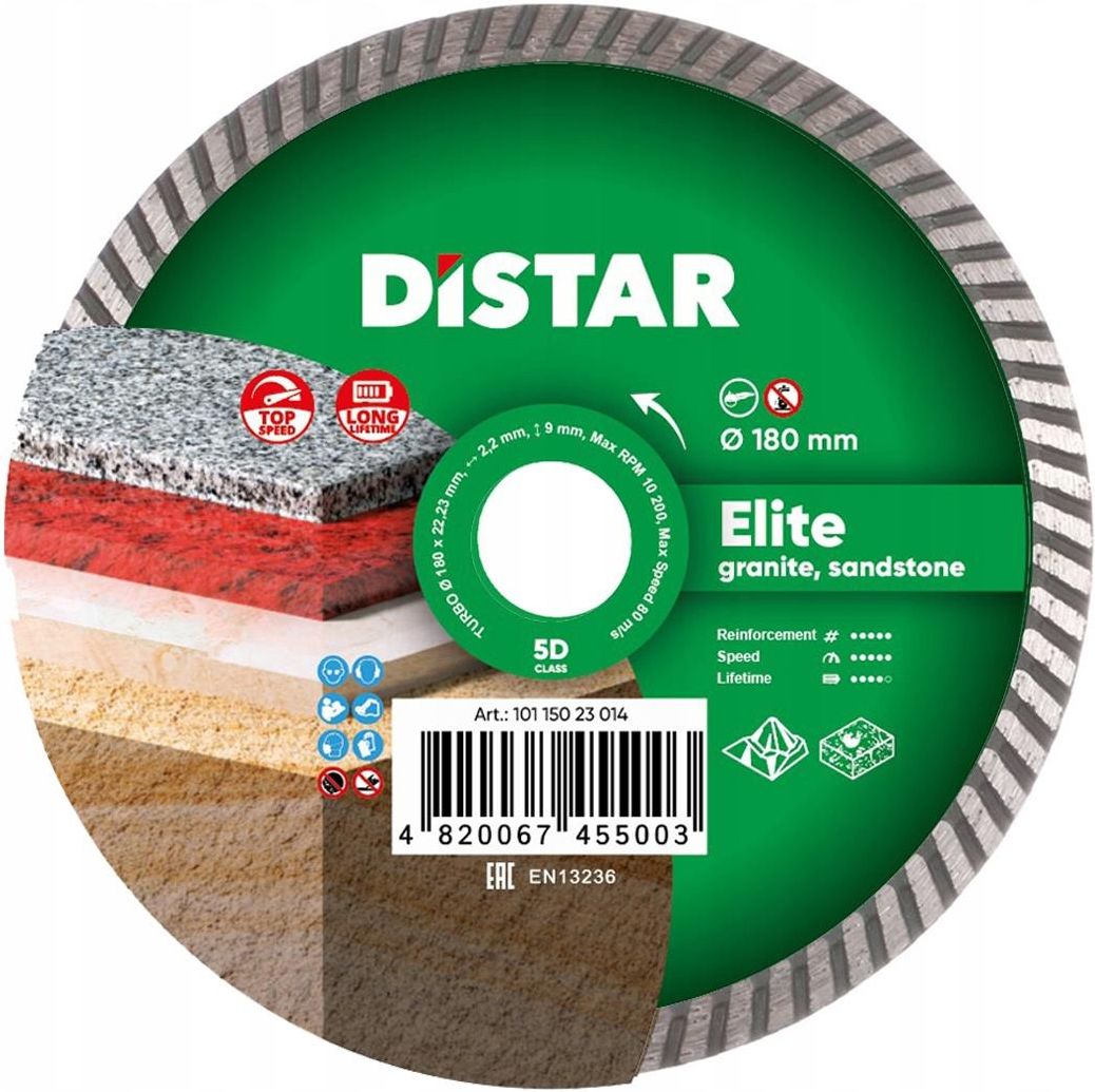 Distar - Diamentowa tarcza tnąca Turbo 180 Elite Szeroka gama obrabianych materiałów. Wysoka trwałość. Granit (wszystkie rodzaje), gres szczególnie twardy, marmur (wszystkie rodzaje), piaskowiec (wszystkie rodzaje).