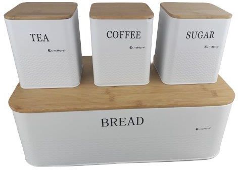 Stylowy i nowoczesny komplet składający się z chlebaka i trzech pojemników: na kawę, herbatę i cukier. Zestaw wykonany z wysokiej jakości drewna bambusowego oraz lakierowanej stali węglowej. Produkty wyposażone w solidną pokrywkę otwieraną od góry poprzez całkowite zdjęcie. Pojemniki dzięki swojemu oryginalnemu designowi stanie się ciekawym elementem dekoracyjnym kuchni. Specyfikacja: chlebak - długość: 42 cm / szerokość: 23 cm / wysokość: 14,5 cm pojemnik do herbaty - długość: 11,5 cm / szerokość: 11 cm / wysokość: 14 cm pojemnik do kawy - długość: 11,5 cm / szerokość: 11,5 cm / wysokość: 14 cm pojemnik do cukru - długość: 11,5 cm / szerokość: 11,5 cm / wysokość: 14 cm Informacje dodatkowe: Komplet: chlebak + 3 pojemniki wykonany ze stali węglowej lakierowanej Pokrywki pojemników i chlebaka wykonane z drewna bambusowego Kolor zewnętrzny: biały Nadruk słowny w kolorze czarnym na froncie pojemnika Opakowanie: kolorowy karton