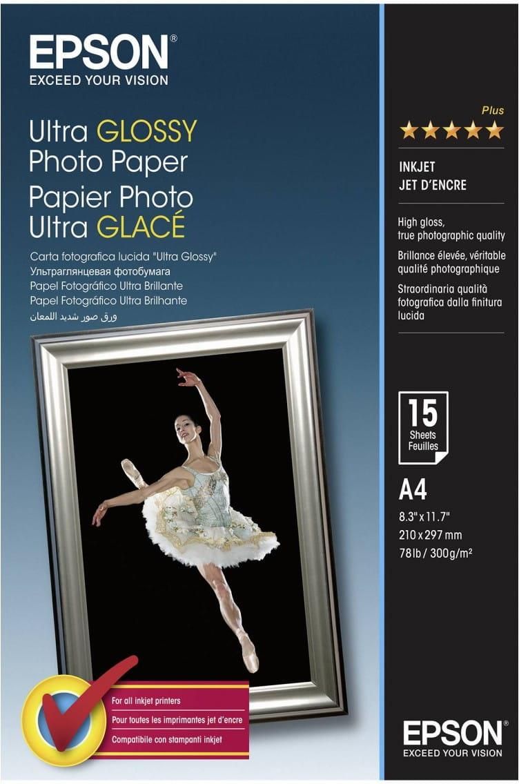 Epson Ultra Glossy Photo Paper - A4 - 15 Arkuszy C13S041927 Osiągnij w domu profesjonalny poziom jakości, używając papieru Ultra Glossy Photo Paper. Z łatwością przygotujesz zdjęcia warte umieszczenia w galerii, które wytrzymają próbę czasu dzięki temu znakomitemu papierowi fotograficznemu. Ulepsz swoje zdjęcia Zachwycaj zmysły, korzystając z naszego papieru Ultra Glossy Photo Paper. Ten wyrafinowany papier opracowano z myślą o uzyskaniu profesjonalnego wyglądu i faktury zdjęć dzięki imponującej gramaturze 300 g/m². Jedna prosta inwestycja może sprawić, że Twoje zdjęcia osiągną profesjonalny poziom jakości. Najlepsze połączenie Drukuj szybkoschnące zdjęcia odporne na rozmazywanie i działanie wody, z żywymi kolorami, pięknymi odcieniami i niezwykłą wyrazistością szczegółów, wykorzystując papiery i atramenty firmy Epson. Ten papier został opracowany specjalnie pod kątem atramentów i drukarek firmy Epson w celu uzyskania najlepszej możliwej jakości. Oznacza to, że wszystko na zdjęciach będzie takie jak w rzeczywistości — z naturalnymi kolorami, płynnymi przejściami tonalnymi, realistycznymi odcieniami skóry i nie tylko. Ciesz się zdjęciami przez wiele lat Choć zdjęcia służą do uwieczniania ulotnych chwil, możesz mieć pewność, że ten papier opracowano i przetestowano pod kątem trwałości uzyskiwanej w wyniku stosowania naszych drukarek i atramentów. Do każdej drukarki Nasze papiery fotograficzne dają znakomite rezultaty we współpracy z drukarkami i atramentami innych producentów, więc każdy może korzystać ze specjalistycznej wiedzy firmy Epson.