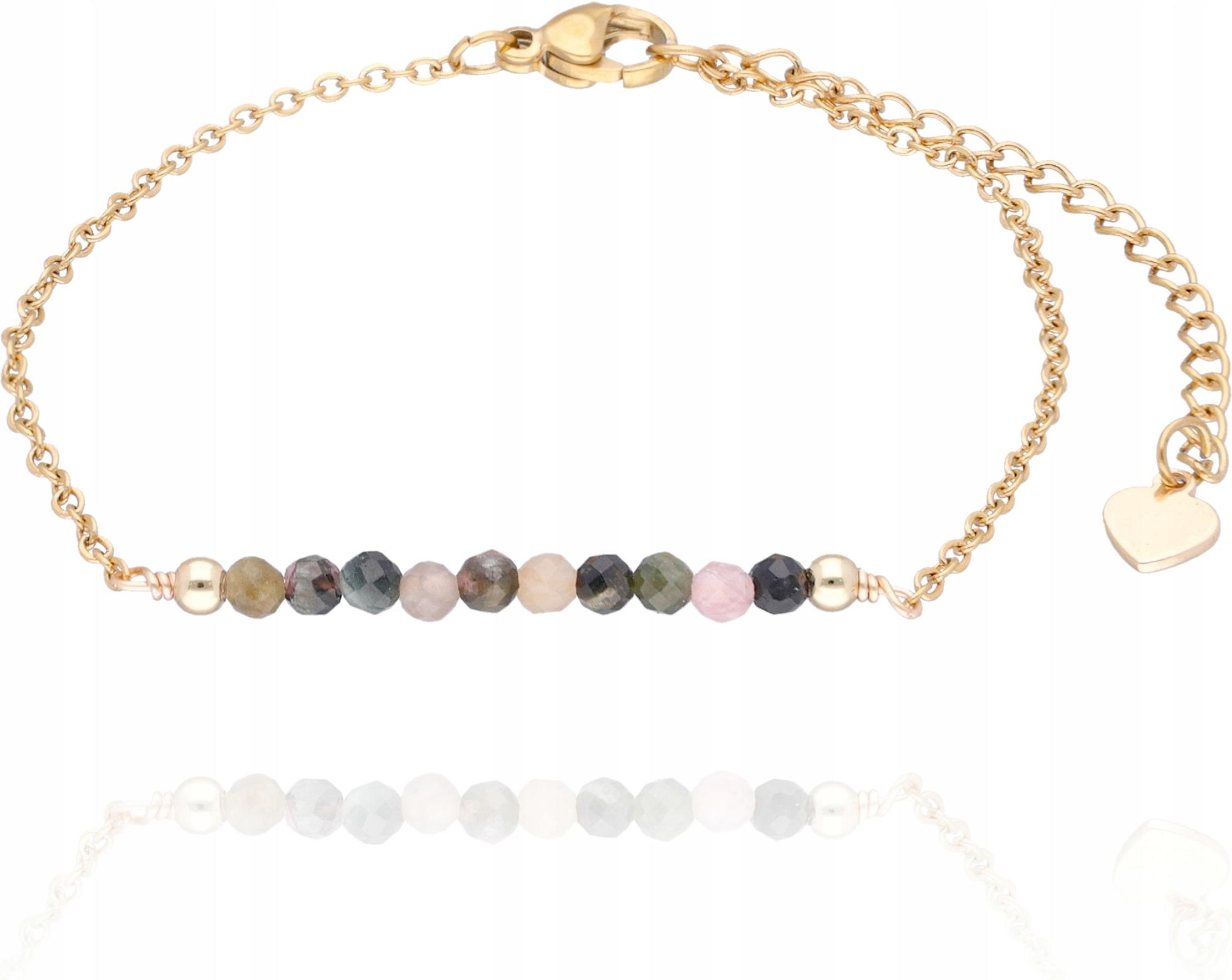 Bransoletka z Kamieniami Turmalin Tęczowy Delikatna Bransoletka z Naturalnymi Kamieniami Drobne Kuleczki Bransoletka z Kamieniem Turmalin Specyfikacja Kamień: turmalin Długość: około 17 cm + 5 cm regulacji Koralik: około 3 mm, fasetowany Ozdobnik: około 3,5 cm, kamienie i kuleczki Kolor: złoty, wielokolorowy Zapięcie: klasyczne, z regulacją Materiał: kamień, stal szlachetna pozłacana Każda bransoletka jest unikatowa. Zdjęcia przedstawiają przykładowe bransoletki. Bransoletka wysyłana losowo. Opakowanie: ozdobna tekturka biżuteryjna. Bransoletka z Kolorowymi Kamieniami Cechy: Kamienie naturalne: fasetowane turmaliny. Kolorystyka: mieszanka wielobarwnych odcieni – od różu, przez zieleń, aż po głębokie bordo i inne. Zapięcie: klasyczne zapięcie typu karabińczyk w kolorze złotym. Regulacja długości: przedłużka z ozdobną zawieszką w kształcie serduszka. Styl: subtelny, minimalistyczny, kobiecy. Zalety: Uniwersalna: idealna do różnorodnych stylizacji. Właściwości kamienia: turmalin niesie dobrą energię, zrozumienie, otwartość. Regulowana długość: komfortowe dopasowanie do każdego nadgarstka. Fasetowane kamienie: pięknie odbijają światło, tworząc efekt subtelnego blasku. Bransoletka z Kamieniem Naturalnym Turmalin Tęczowy turmalin to kamień szlachetny znany ze swojej oszałamiającej gamy odcieni, ma głębokie symboliczne znaczenie, które urzekało ludzi na przestrzeni dziejów. Kolorowy turmalin zapewnia równowagę emocjonalną i harmonię poprzez wyrównywanie różnych czakr w ciele. Ma zdolności do inspirowania umysłu, stymuluje intuicję, pomaga w łączeniu się z wyższymi sferami świadomości. Potrafi usuwać blokady zarówno w sferze fizycznej, jak i duchowej. Sprzyja relaksowi i finalnie poprawia ogólne samopoczucie.