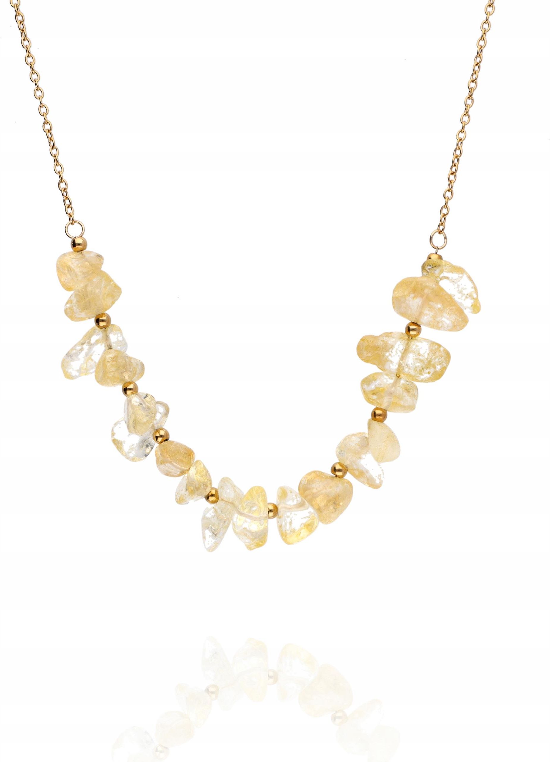 Naszyjnik z kamieniami cytrynu Biżuteria na różne okazje Delikatny łańcuszek ze stali szlachetnej w złotym kolorze. Cytryn słynie z przyciągania bogactwa i dobrobytu. Nieregularne kształty oszlifowanych kamieni potęgują połysk i ruch naszyjnika. Uniwersalny styl. Naszyjnik świetnie komponuje się z …
