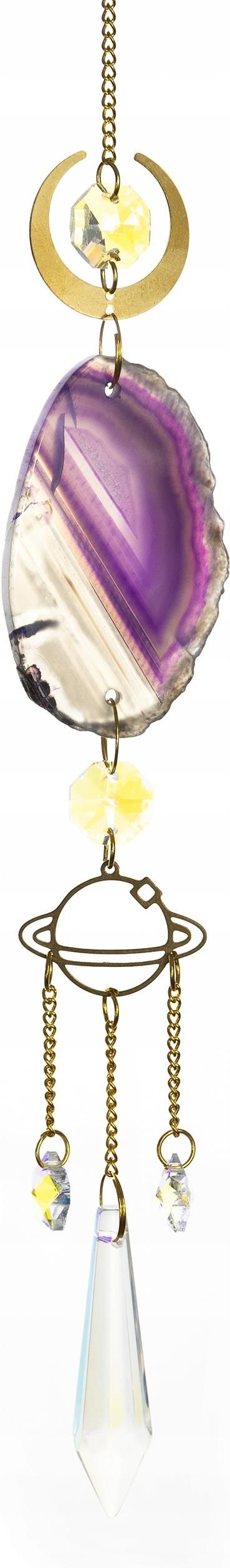Kryształowy Łapacz Słońca Zawieszka Ozdobna Agat Fioletowy Symbol Kosmos Planeta Łapacz Słońca z Kryształami Specyfikacja Materiał: metal, szkło, kamień Kamień: agat Kolor: złoty, fioletowy, tęczowy Długość: około 40-45 cm Szerokość: około 3-5 cm Symbol: kosmos, planeta Plaster agatu: 4-6 cm Ręczne tworzenie oraz zawartość naturalnego kamienia sprawiają, że każdy łapacz jest unikatowy. Cena dotyczy jednego łapacza wysłanego losowo. Zdjęcia przedstawiają przykładowe łapacze. Zawieszka na Okno Cechy Efekty świetlne: Kryształy odbijają światło, tworząc rozpraszające się refleksy, które rozświetlają przestrzeń i dodają jej uroku. Ożywia wnętrze: Dzięki nim wnętrze nabiera blasku i wyjątkowej atmosfery, przyciągając spojrzenia i budząc zachwyt. Energia kamieni: Agat symbolizuje równowagę, harmonię i wewnętrzny spokój, wspierając stabilność emocjonalną oraz duchową siłę. Uważany jest za kamień ochronny, chroniący przed negatywną energią i wzmacniający odwagę. Symbol planety odnosi się do sił kosmicznych, cykli życia oraz wpływu ciał niebieskich na ludzkie losy i naturę. Łatwy w użyciu: Na jego końcu znajduje się kółeczko, dzięki któremu wygodnie zawiesisz go w wybranym miejscu. Pomysł na prezent: Dobry pomysł na wyjątkowy prezent. Sun Catcher Łapacz Słońca Zastosowanie Funkcja: Łapacze słońca to ozdobne przedmioty, specjalnie zaprojektowane do przechwytywania światła słonecznego i rozpraszania jego promieni w różnych kierunkach. Zalety: Ich główną funkcją jest tworzenie pięknych efektów wizualnych poprzez odbijanie i rozpraszanie światła, co nadaje pomieszczeniom wyjątkowego uroku i atmosfery. Amulet szczęścia: W niektórych tradycjach i wierzeniach, łapacze słońca traktuje się jako przedmioty przynoszące szczęście, pozytywną energię oraz chroniące przed złymi duchami. Wybierz miejsce z dostępem do promieni słonecznych i pozwól łapaczowi je złapać! Może będzie to sypialnia, w której powitasz pierwsze promienie słońca, może wolisz rozświetlić salon, łazienkę, kuchnię, a nawet gabinet czy biuro?
