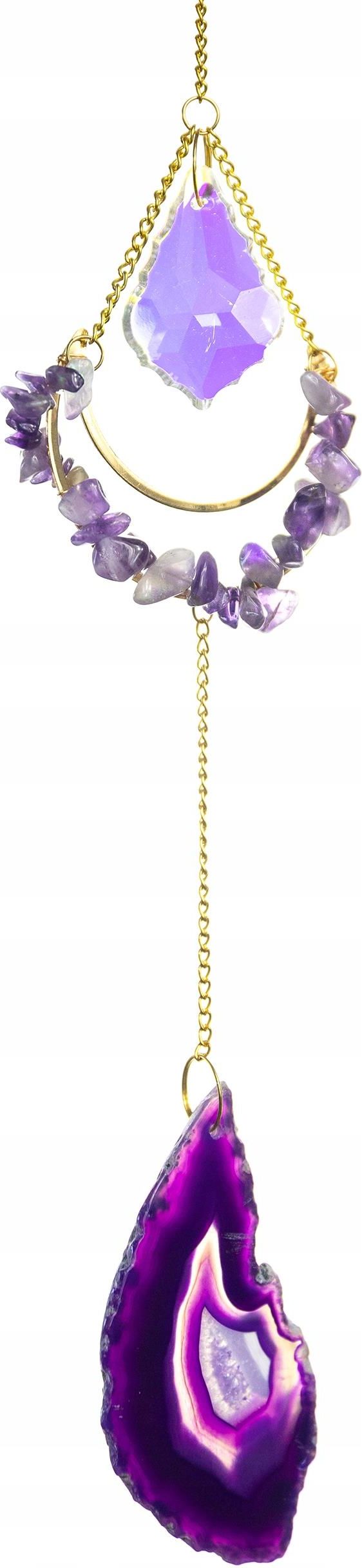 Kryształowy Łapacz Słońca Fioletowy Zawieszka Ozdobna z Fioletowymi Kryształami Łapacz Słońca z Kryształami Specyfikacja Materiał: metal, szkło, kamień Kamień: agat (plaster), ametyst (drobny) Kolor: złoty, fioletowy, tęczowy Długość: około 31 cm Szerokość: około 5 cm Plaster agatu: około 4-6 cm …
