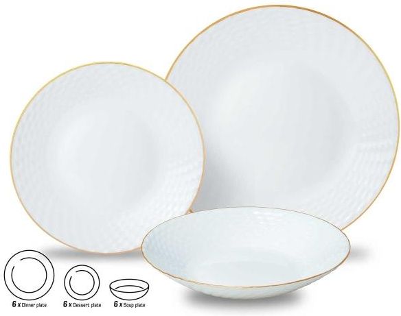 Zastawa stołowa Serwis Komplet obiadowy talerzy 18 ele. na 6 osób Marka: KINGHOFF Kod produktu: KH-1876 Zestaw zastawy stołowej KINGHOFF KH-1876 to idealne rozwiązanie dla tych, którzy cenią sobie połączenie elegancji, trwałości i funkcjonalności. To wyjątkowy komplet talerzy, który nie tylko podkreśli styl Twojego stołu, ale także stanie się niezastąpionym elementem każdej jadalni. Dzięki wysokiej jakości wykonania i ponadczasowej estetyce, zestaw sprawdzi się zarówno podczas codziennych posiłków, jak i przy szczególnych okazjach. Kompleksowy zestaw dla 6 osób – w skład kompletu wchodzą: 6 talerzy obiadowych o średnicy 25,4 cm (10 cali),6 talerzy deserowych o średnicy 19 cm (7,5 cala),6 talerzy do zupy o średnicy 21,5 cm (8,5 cala). Ceramika najwyższej jakości – wykonane z trwałego i solidnego materiału, naczynia zapewniają długowieczność i odporność na uszkodzenia, a ich ponadczasowy biały kolor ze złotym rantem dodaje wyrafinowanego uroku. Praktyczne rozwiązania – zastawa została zaprojektowana z myślą o wygodzie użytkowania. Elegancja i styl – delikatne złote wykończenie dodaje luksusowego charakteru, dzięki czemu zestaw doskonale sprawdzi się na uroczystych przyjęciach, podkreślając wyjątkowy nastrój każdego spotkania. Uniwersalność i praktyczność – zestaw KINGHOFF KH-1876 to doskonały pomysł na prezent na każdą okazję – od ślubów po jubileusze – lub jako uzupełnienie domowej kolekcji zastawy stołowej. Zalecamy mycie ręczne w delikatnym detergencie. Mycie w zmywarce dopuszczalne wyłącznie na delikatnych programach. Nie używać w kuchence mikrofalowej. KINGHOFF KH-1876 łączy w sobie estetykę i wygodę użytkowania, oferując produkt, który spełni oczekiwania nawet najbardziej wymagających użytkowników. To nie tylko funkcjonalny zestaw talerzy, ale również element, który doda prestiżu Twojej jadalni. Wybierz ten komplet, aby nadać swoim posiłkom wyjątkowego charakteru i cieszyć się jego niezrównaną jakością przez lata.