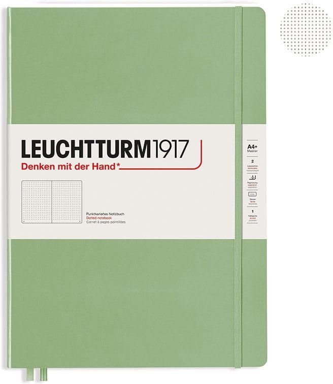 Notatnik Leuchtturm1917 w kropki 100g Slim A4+ twarda okładka - Szałwiowy Notatnik marki Leuchtturm1917 w twardej okładce z kartkami w kropki doskonale sprawdzi się zarówno w domu, jak i biurze; zadba o porządek i przejrzystość zapisanych tekstów. Notatnik zaprojektowano w najmniejszym szczególe. Leuchtturm1917 to czysta forma i funkcjonalne detale. Zawiera pusty spis treści, dzięki któremu można w prosty sposób uporządkować notatki. Kilka ostatnich stron jest perforowanych, aby w razie potrzeby łatwo można było oderwać kartkę. Posiada samoprzylepne etykiety, które pomogą w archiwizacji. Większe gabaryty pozwolą na bezpieczne przechowywanie w nim kartek z zapiskami nawet w rozmiarze A4. Wersja Slim Master jest lżejsza i węższa niż Master Classic. 123 ponumerowanych stron ilość stron: 121 kieszonka na luźne notatki pusty spis treści do samodzielnego wypełnienia elastyczne zamknięcie na gumkę w kolorze okładki 2 wstążkowe zakładki szyty grzbiet otwierany na płasko 8 stron z perforacją papier odpowiedni do atramentu naklejki do archiwizacji i oznaczania rozmiar Master Slim A4+ (225 x 315 mm) papier bezkwasowy z certyfikatem FSC
