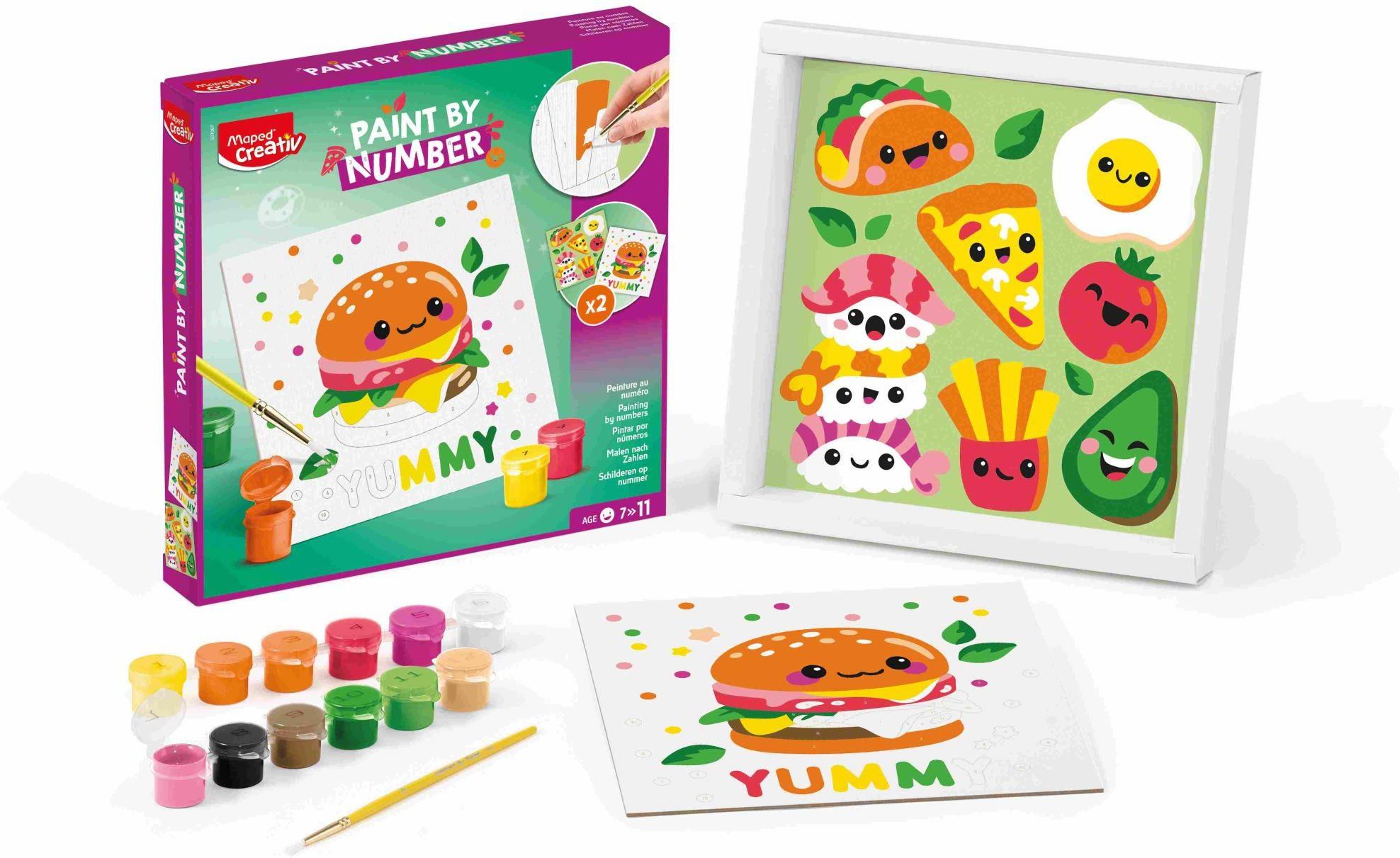Malowanie po numerkach drobne przekąski Yummy Obrazki do malowania po numerach o tematyce Yummy: drobne przekąski. Zestaw przeznaczony dla początkujących artystów, którzy dopiero rozpoczynają swoją przygodę z malowaniem. Zadanie polega na pomalowaniu kształtów kolorowymi farbkami zgodnie z oznaczeniem numerycznym. Każdy kolor farby jest opisany numerkiem, aby nie doszło do pomyłki. Wyraźne linie i liczby ułatwiające malowanie znikają pod farbą. Zabawa stymuluje kreatywność dzieci, ćwiczy sprawność manualną, poprawia koncentrację i daje zadowolenie z efektu. Kolorowe dzieło można wstawić w dołączoną kartonową ramkę, powiesić lub postawić na półce. To też doskonały pomysł na prezent dla najbliższych. Zestaw przeznaczony dla dzieci od 7 roku życia. Zawartość zestawu: dwa obrazki do pokolorowania 20 x 20 cm, ramka, 12 pojemniczków 5,4 ml z farbami akrylowymi, 1 pędzelek, 2 szablony z grafikami i numerami