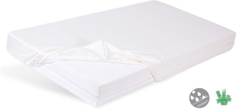 Prześcieradło nieprzemakalne 90x200 01 białe z gumką Bamboo bambusowe podkład Podkład nieprzemakalny bambusowy 90x200 spełnia rolę prześcieradła i ochraniacza jednocześnie. Wyrób wykonany jest tak jak standardowe prześcieradło jersey z gumką. Wierzchnia warstwa prześcieradełka nieprzemakalnego to miękka, delikatna w dotyku w 100% bambusowa dzianina, która jest całkowicie naturalna i zapobiega podrażnieniom skóry dziecka. Spodnia warstwa prześcieradła, to oddychająca membrana poliuretanowa, która nie przepuszcza płynów, a przepuszcza powietrze, chroniąc tym samym materac przed zabrudzeniem. Elastyczne, miłe w dotyku, nie szeleści i przepuszcza powietrze. Rozmiar: 90x200 cm Tolerancja rozmiaru: 3% Skład surowcowy: 100% bambus, 100% PU Gramatura: 160 g/m2 Prześcieradło przeznaczone jest na materace o wysokości do 20 cm. Zakład prześcieradła wynosi 20 cm i nie jest wliczany do rozmiaru. Produkt posiada certyfikat Oeko Tex Standard 100 klasa I. Przepis konserwacji: prać w temperaturze do 40°C, nie wybielać, prasować w temperaturze do 150°C, nie czyścić chemicznie, suszyć w stanie rozwieszonym. Indeks katalogowy: TM0350_01 Kod kreskowy: 5902675062886