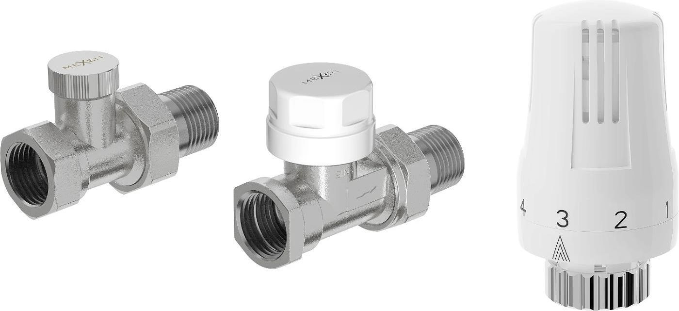 Mexen G01 zestaw termostatyczny prosty, nikiel Producent: Mexen Seria: G01 Kod produktu: W914-012-918-01 Dane techniczne Materiał zaworów: Mosiądz Kolor zaworów: Nikiel Średnica przyłącza zaworów: G 1/2" Temperatura pracy: max 120 °C Maksymalne ciśnienie robocze: 10 bar Gwint głowicy: M30 x 1,5 mm Kolor głowicy: Biały Skala regulacji: 0-5 Zakres regulacji temperatury: 0-29 °C Temperatura otoczenia: max 50 °C Zabezpieczenie przed zamarznięciem 5°C W komplecie zawór grzejnikowy zasilający i odcinający