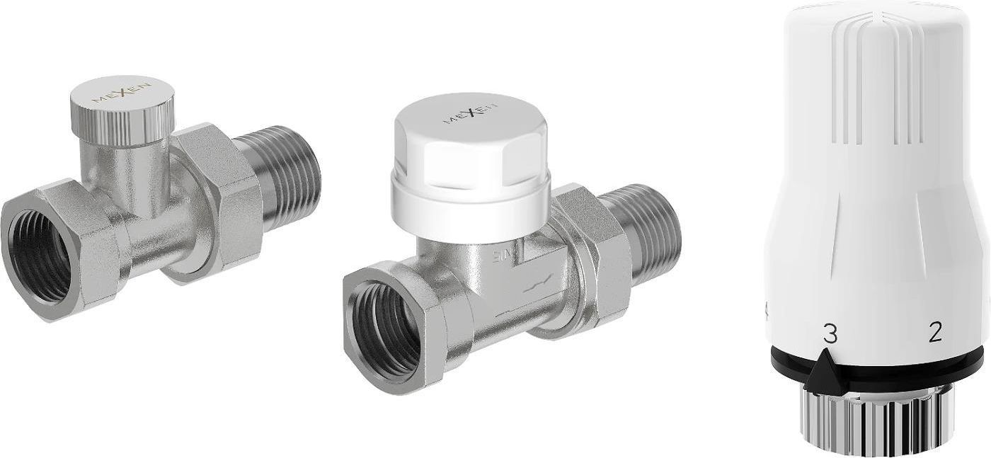 Mexen G02 zestaw termostatyczny prosty, nikiel Producent: Mexen Seria: G02 Kod produktu: W914-012-928-01 Dane techniczne Materiał zaworów: Mosiądz Kolor zaworów: Nikiel Średnica przyłącza zaworów: G 1/2" Temperatura pracy: max 120 °C Maksymalne ciśnienie robocze: 10 bar Gwint głowicy: M30 x 1,5 mm Kolor głowicy: Biały Skala regulacji: 0-5 Zakres regulacji temperatury: 0-29 °C Temperatura otoczenia: max 50 °C Zabezpieczenie przed zamarznięciem 5°C W komplecie zawór grzejnikowy zasilający i odcinający