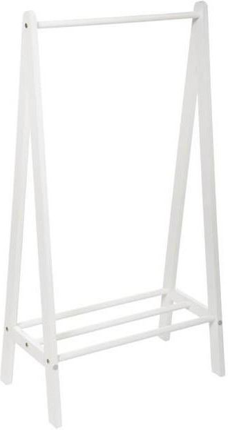 Stojak na wieszaki wykonany z drewna w kolorze białym. W dolnej części umocowana jest półeczka z 3 szczebelkami. Niewielkie rozmiary (58x30x115 cm) pozwolą na postawienie wieszaka w dziecięcym pokoju. Produkt hand-made.
