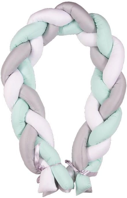 Ochraniacz do łóżeczka Warkocz pleciony 01+42+33 satynowy bawełniany biały miętowy szary długość 200cm pełni funkcję ochronną oraz dekoracyjną. Zabezpiecza dziecko przed uderzeniem o szczebelki łóżeczka. Sprawdzi się jako izolacja od zimnej ściany, ochrona na szczebelki oraz jako poduszka. Mocowany …