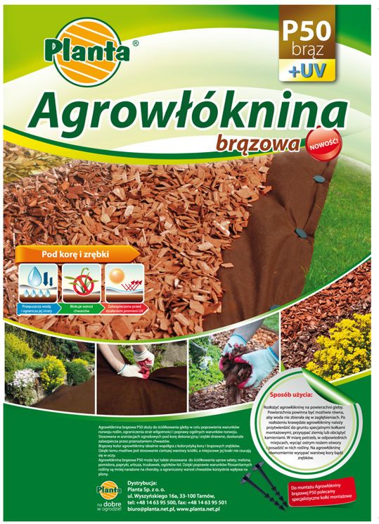 Agrowłóknina do przykrywania roślin uprawnych, stosowana w celu zapewnienia roślinom lepszych warunków wzrostu i poprawy ich cech jakościowych. Agrowłóknina brązowa (oraz czarna) jest przeznaczona do ściółkowania gleby w celu poprawienia warunków wzrostu różnych roślin uprawnych. Ściółkowanie agrowłókniną czarną umożliwia wyeliminowanie chwastów bez uciekania się do stosowania herbicydów, ochronę gleby przed utratą wody wskutek parowania oraz wydatną poprawę warunków fitosanitarnych, dzięki czemu rośliny są mniej narażone na porażenie chorobami. Agrowłóknina czarna, w przeciwieństwie do innych materiałow, jest przepuszczalna dla wody. Agrowłóknina chroni rośliny przed: - przymrozkami i niskimi temperaturami, - silnymi wiatrami, - zbyt szybką utratą wody glebowej, - gwałtownymi opadami, - uszkodzeniem przez gradobicie, - zanieczyszczeniem pyłami, - szkodliwymi owadami, - uszkodzeniem przez gryzonie i ptaki. Dzięki tym właściwościom, zwłaszcza wyższej o kilka stopni temperatury powietrza i gleby pod osłoną, stosowanie agrowłóknin pozwala na zapewnienie roślinom dobrych warunków wzrostu. Oprócz owoców i warzyw Osłaniane są również rośliny ozdobne, szczególnie w okresach przymrozków nocnych.