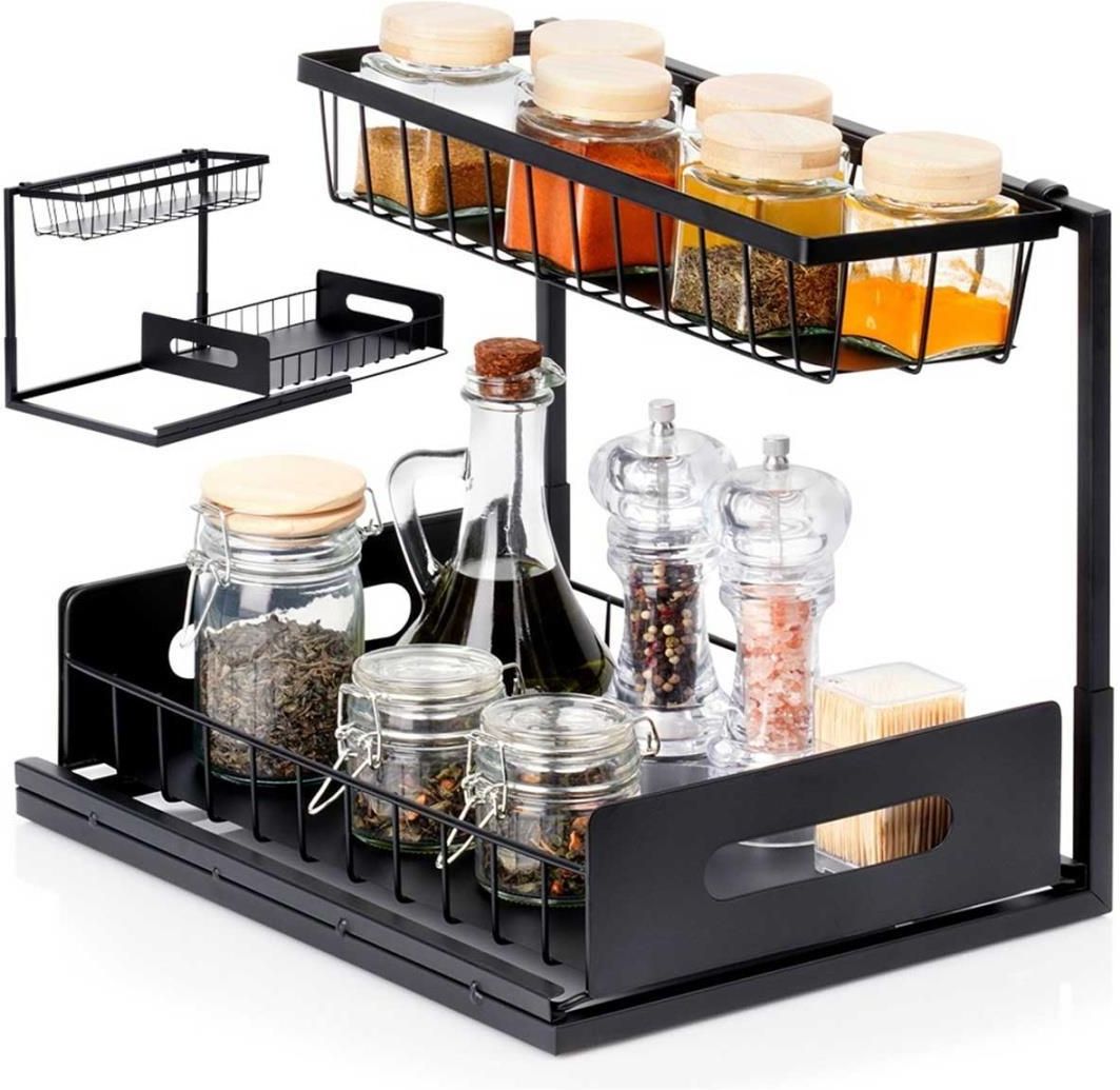 Dwupoziomowa półka kuchenna z wysuwaną dolną szufladą. Idealna do organizacji przypraw, słoiczków i butelek. Metalowa w czarnym kolorze. Dwupoziomowa półka kuchenna z wysuwaną szufladą – Praktyczna półka do przechowywania przypraw, słoiczków i akcesoriów kuchennych. Wymiary zewnętrzne półki 36 x 27 …