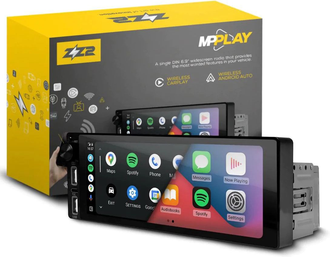 Radio z bezprzewodowym Android Auto i CarPlay. Ekran dotykowy 6,9". Rozmiar montażowy 1 DIN. Opcja podłączenia kamery cofania. Dwa porty USB (front), USB (tył). Mikrofon zewnętrzny. Język polski w menu, fizyczny potencjometr (gałka).