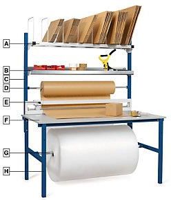 Elegancki: stalowe, gładkie ramy, malowane proszkowo na niebiesko (symbol RAL 5017), blat i półki szare. Wysoka jakość wykonania. Dostarczany w zestawie z instrukcją montażu. A 1 metalowa półka z 8 ruchomymi przegrodami na opakowania tekturowe. B 1 metalowa półka na akcesoria. C 2 ramy o długości 1030 mm. D 1 wałek na rolkę papieru lub lekkich folii (Ø 300 mm i max. waga 50 kg). E 1 gilotyna z okrągłym ostrzem. Max. szerokość noża: 1250 mm. F 1 laminowany blat roboczy: grubość 20 mm. Rama stalowa. Maksymalne obciążenie: 200 kg. G 1 wałek na rolkę cięższego papieru lub folii (Ø 750 mm i max. waga 150 kg). H 1 stalowa rama Obciążenie: 200 kg. Wysokość stanowiska do pracy: 850 mm. Sprzedawany na sztuki. Cena za 1 kompletny stół do pakowania.