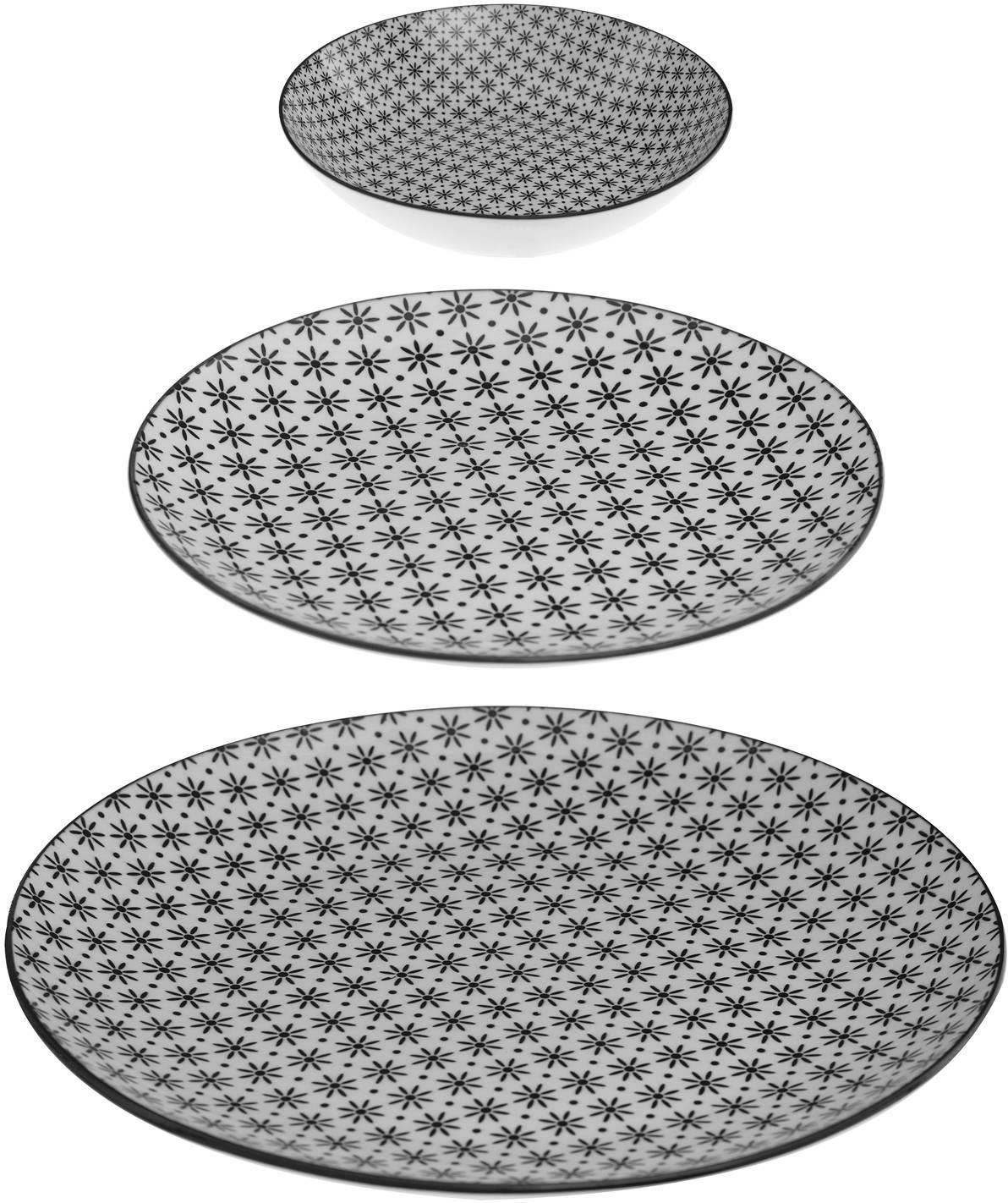 SERWIS OBIADOWY 6 osób BOHEMIA porcelana kwiatowy Stylowy i piękny zestaw obiadowy dla 6 osób Producent: Secret de Gourmet Materiał dominujący: porcelana długość (cm): 27 szerokość (cm): 27 Wysokość (cm): 2.5 Średnica (cm): 27 Serwis obiadowy BOHEMIA - Uniwersalność i elegancja na Twoim stole Wielofunkcyjny komplet: Komplet serwisu BOHEMIA dla 6 osób łączy w sobie praktyczność i elegancję, idealnie nadaje się na każdą okazję, od codziennych posiłków po uroczyste kolacje. Pełna gama rozmiarów: Komplet obejmuje talerze o trzech różnych średnicach - 19 cm, 20 cm i 26,5 cm, umożliwiając dopasowanie naczynia do różnorodnych potraw, od przystawek po dania główne i desery. Wzornictwo dla każdego: Dostępny w czterech unikalnych, czarno-białych wzorach, serwis BOHEMIA doskonale komponuje się z różnymi aranżacjami i gustami, pozwalając na stworzenie indywidualnej kompozycji na stole. Praktyczna elegancja: Nie tylko pięknie prezentuje się na stole, ale także jest praktycznym uzupełnieniem codziennych i świątecznych posiłków, dzięki czemu każda chwila spędzona przy stole staje się wyjątkowa. Wytrzymałość i funkcjonalność: Każdy talerz wykonany z najwyższej jakości porcelany w kolorze białym, charakteryzuje się odpornością i wytrzymałością. Cały zestaw jest przystosowany do mycia w zmywarce, co ułatwia utrzymanie czystości. 59155