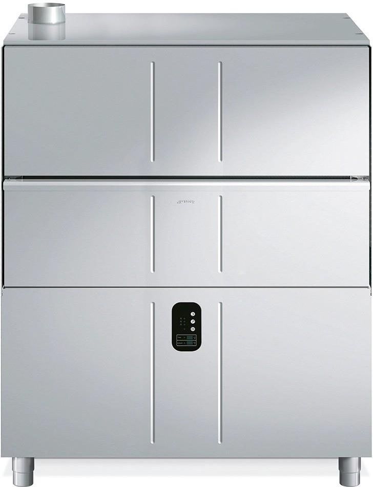 Zmywarka gastronomiczna do akcesoriów marki SMEG. Posiada sterowanie elektroniczne. Odbudowa wykonana ze stali nierdzewnej AISI 304 o pojedynczych ściankach. Komora posiada podwójne ścianki oraz zaokrąglone krawędzie, ułatwiające utrzymanie higieny. Drzwi z izolacją termo-akustyczną. W zmywarce zamontowane dozowniki perystaltyczne do płynu nabłyszczającego oraz płynu myjącego z regulacją elektroniczną. Ponadto zmywarka jest wyposażona w system płukania HTR ( bojler atmosferyczny i pompę płukania). Za mycie odpowiadają 3 pompy myjące z systemem soft start oraz opcją opóźnionego startu. Po 4 ramiona płuczące i myjące wykonane ze stali nierdzewnej AISI 304. Odpływ wspomagany pompą spustową z 2-stopniowym filtrem nieczystości. System płukania z funkcją termostop zapewniającą optymalną temperaturę cyklu płukania. Wysokość wejścia do komory zmywarki wynosi 85 cm. Wymiary kosza do zmywarki wynoszą 60x132 cm. Wydajność zmywarki to max 30 koszy na godzinę. Zbiornik zmywarki ma pojemność 130 l, a wbudowany bojler 17 litrów. Zmywarka wyposażona w automatyczny system wykrywania defektów. Zmywarka posiada 3 programy: P1 trwający 120 sekund, P2 240 sekund oraz P3 zmywanie ciągłe. Wysokość zmywarki po otwarciu komory 243 cm. Urządzenie przystosowane do mycia pojemników GN.