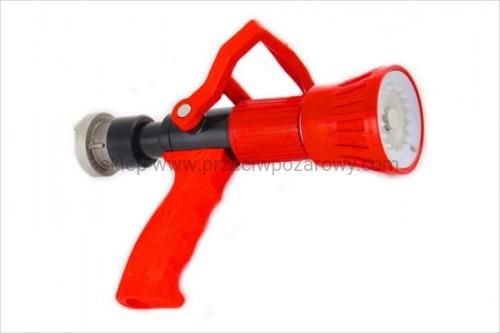 Prądownica Turbo z nasadą 52/C Prądownica TURBO wyposażona w zawór kulowy, przeznaczony do wytwarzania strumieni zwartych i rozproszonych z płynną regulacją kąta bryłowego strumienia rozproszonego do 110º przy stałej wydajności. Przepływ: 200 l/min
