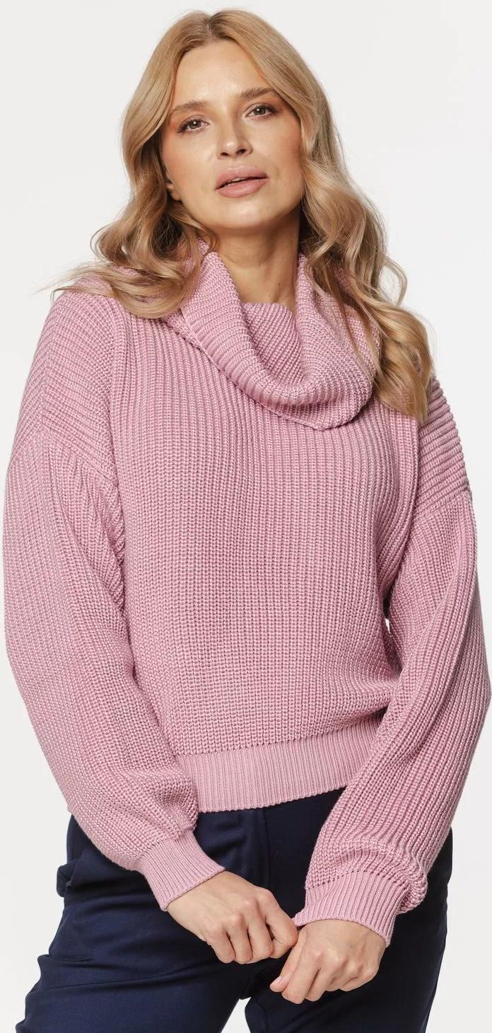 Sweter damski z dekoltem typu woda Sweter damski z najnowszej kolekcji Willsoor. Doskonały zarówno na ciepłe jak i chłodne dni. Fason: prosty, loose fit Dekolt: duży golf typu woda Kolor: różowy o grubym, mięsistym splocie Rękawy: długie zakończone ściągaczem Skład: 100% wiskoza bambusowa Jakość: pierwsza Uszyty w Polsce
