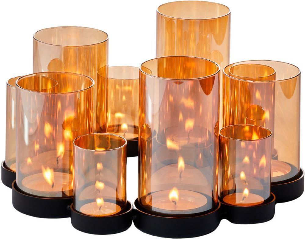 BP01 Lampion, świecznik na tealighty, bursztynowy wieniec Producent: Philippi Wymiary przybliżone (wys x szer x głęb w cm): 29 x 15 x 15 cm 10 miejsc na świece Materiał: szkło i stal Migoczący blask świec sprawia, że wnętrze staje się bardziej przytulne, a kolacja uroczysta. Lampion szklany …