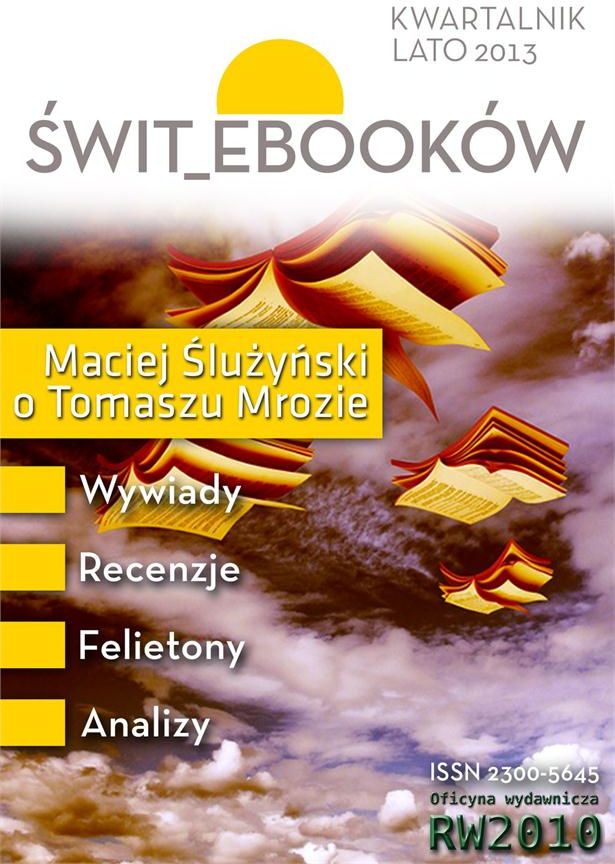 Pierwszy polski e-magazyn o e-książkach, e-pisarzach, e-czytelnictwie, self-publishingu. Proponujemy: wywiady, felietony, recenzje, opinie, analizy rynku, opowiadania. Prezentujemy z dumą drugi numer naszego e-magazynu: Lato 2013. zapraszamy i zachęcamy do współpracy: recenzentów, autorów, wydawców, dystrybutorów. Redaktor naczelny: Maciej Ślużyński Sekretarz redakcji: Joanna Ślużyńska Współpraca:Awiola, Magda Barwińska, Ciernik, Robert Drózd, Agnieszka Hałas, Ewa „Oksa” Jeznach, Stanisław Karolewski, Marcin Łukiańczyk, Robert A. Mason, Alicja Minicka, Piotr Mrok, Tomasz Mróz, Pokrzywnica, Paweł Pollak, Emma Popik, Łukasz Sporyszkiewicz, Alicja Szulborska, Kinga Tutkowska, Władysław zdanowicz, Agnieszka Żak.
