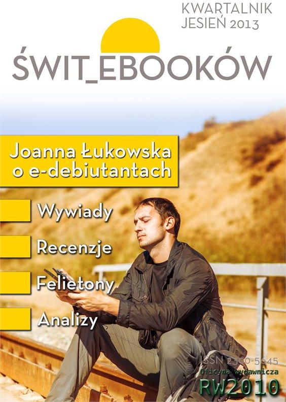 Pierwszy polski e-magazyn o e-książkach, e-pisarzach, e-czytelnictwie, self-publishingu. Proponujemy: wywiady, felietony, recenzje, opinie, analizy rynku, opowiadania. Prezentujemy z dumą trzeci numer naszego e-magazynu: Jesień 2013. Zapraszamy i zachęcamy do współpracy: recenzentów, autorów, wydawców, dystrybutorów. Redaktor naczelny: Maciej Ślużyński Sekretarz redakcji: Joanna Ślużyńska Przy trzecim numerze współpracowali z nami: Awiola, Ciernik, Robert Drózd, Filip Kaczmarek, Joanna Łukowska, Kinga Olkusz, Anna Packalén Parkman, Pokrzywnica, Aleksander Sowa, Waniliowa, Agnieszka Żak, Marta Żołnierowicz. Trzeci numer Świtu ebooków – Jesień 2013 – poświeciliśmy głównie debiutantom. Znajdziecie tu zatem garść porad i uwag tyczących bycia e-debiutantem i e-pisarzem. Poza tym jak zwykle: wywiady, recenzje, analizy, opowiadania (debiutantów oczywiście).