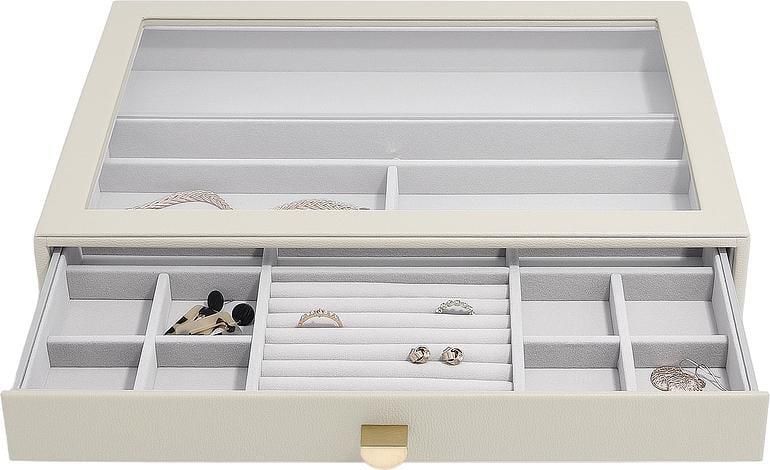 Szkatułka na biżuterię Stackers 16 komorowa supersize jasnobeżowa z szufladą i szklaną pokrywką Żyrardów