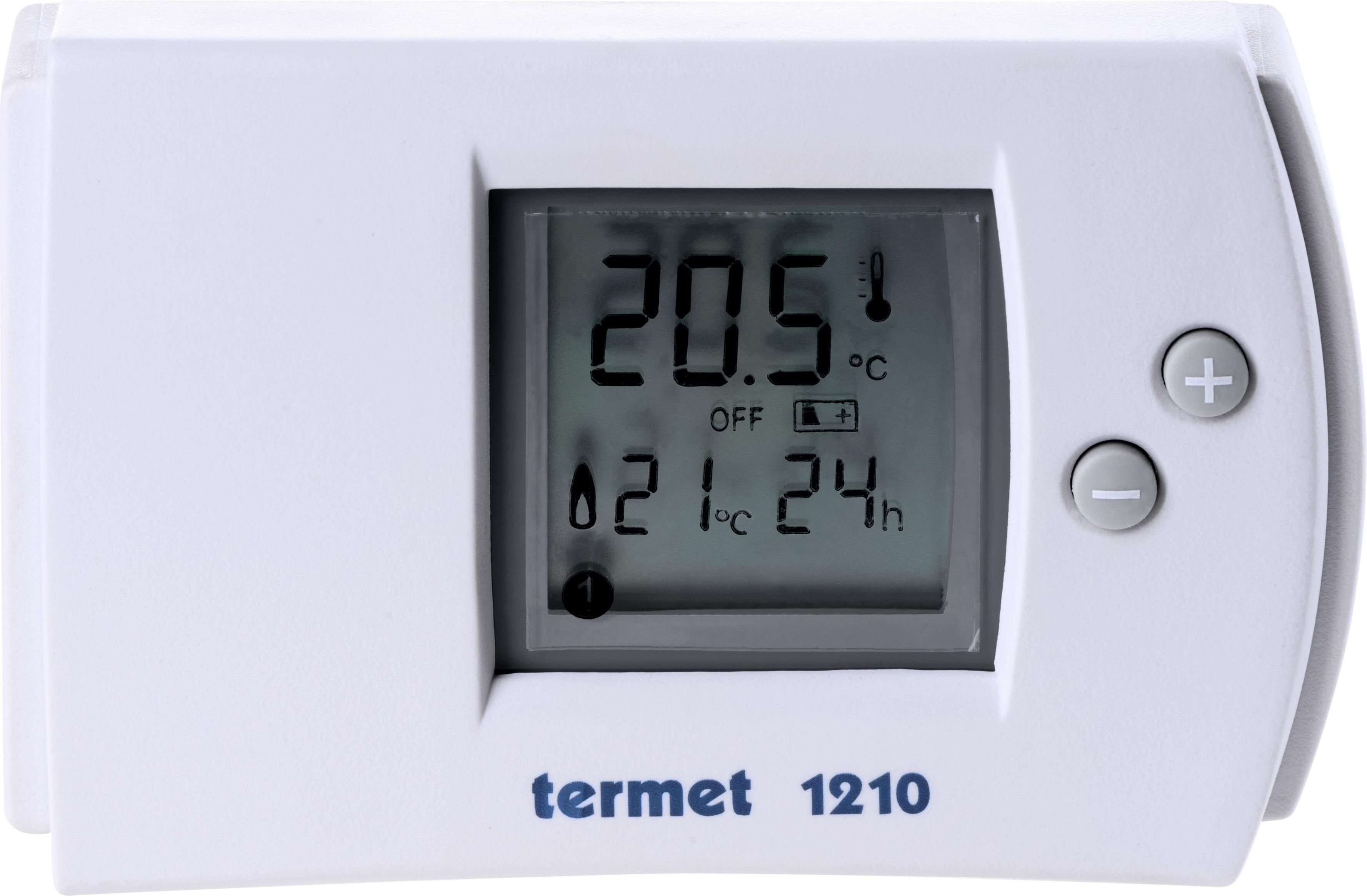Termet 1210 to prosty w obsłudze model sterownika temperatury, umożliwiający łatwe sterowanie temperaturą w pomieszczeniach. Zastosowany w nim ciekłokrystaliczny, czytelny wyświetlacz wskazuje ustawioną temperaturę oraz informuje o konieczności wymiany baterii. Regulator posiada własne zasilanie bateryjne oraz wskaźnik pracy urządzenia grzewczego. Cechy charakterystyczne: -zakres pomiaru temperatury 0˚C - 40˚C -podziałka temperatury 0,5˚C -wyświetlacz ciekłokrystaliczny