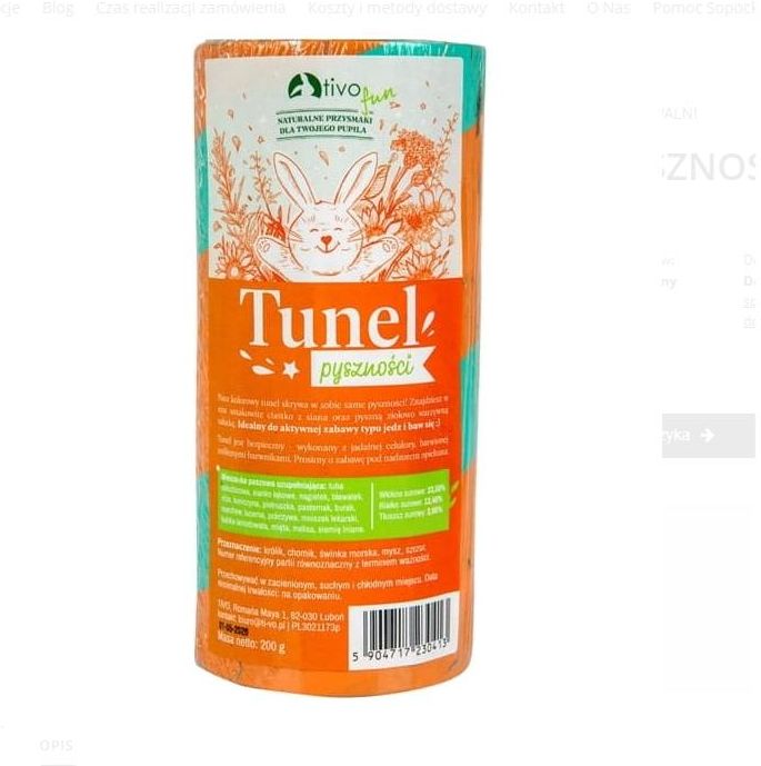 TUNEL PYSZNOŚCI 200G TIVO TUNEL PYSZNOŚCI 200G TIVO Tunel Pyszności to wyjątkowy produkt, który łączy bogaty zestaw naturalnych składników w jednej smakowitej przekąsce. Korzyści Sianko łąkowe – naturalne źródło błonnika i minerałów, wspiera zdrowie układu pokarmowego oraz pomaga w oczyszczaniu …