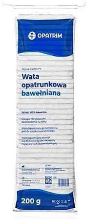 OpisOpatrim Wata opatrunkowa bawełniana to niesterylny wyrób medyczny opracowany dla osób z raną lub skaleczeniem do oczyszczenia przed założeniem opatrunku oraz jako okład lub kompres, a także do przemywania miejsc iniekcji oraz w ramach dbania o higienę. Nie stosować bezpośrednio na uszkodzoną skórę. Skład wyrobu medycznego100% bawełna.Zawartość opakowaniaWata opatrunkowa bawełniana 200 g Przeznaczenie wyrobu medycznegoDo oczyszczania skóry, jako materiał chłonny do celów opatrunkowych i higienicznych oraz do okładów i kompresów. Sposób użycia wyrobu medycznegoNasącz właściwą ilość waty wodą lub środkiem dezynfekującym. Przemyj otarcia naskórka, skaleczenia oraz miejsca do iniekcji. Można stosować jako materiał chłonny do celów opatrunkowych i higienicznych. Ostrzeżenia i środki ostrożnościNie stosować, jeśli opakowanie było wcześniej otwierane lub jest uszkodzone. Wyrób jednorazowego użycia. Nie używać ponownie. Przechowywać w chłodnym, suchym miejscu. Chronić od światła. Przechowywać w sposób niedostępny dla dzieci.