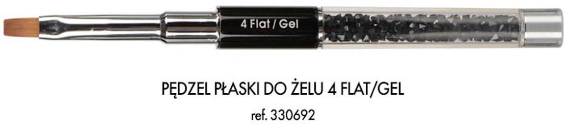 NAIL ART Pędzel do żelu 4 płaski Płaski pędzel do aplikacji żelu z gęstym, równo ściętym włosiem. Szerokość i kształt typu FLAT idealnie dopasowuje się do płytki paznokcia. Zapewnia miękkie nakładanie żelu. Elegancka rękojeść wypełniona czarnymi kryształkami świetnie leży w dłoni. CECHY PRODUKTU: …