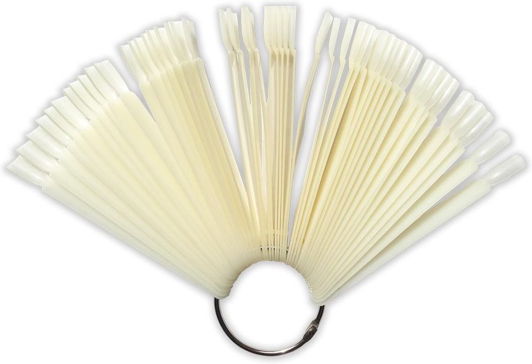 Wzornik wachlarz, 50 tipsów w kolorze mlecznym lub transparentnym. Idealny do ekspozycji palety kolorów oraz prac autorskich. Wzornik zawiera 50 szt. pojedynczych wzorników umocowanych na metalowym kole. To bardzo wygodna, czytelna i estetyczna forma prezentacji. Wzornik można wykorzystywać do malowania lakierami, hybrydami czy też żelami. Paleta jest niewielka, poręczna i solidnie wykonana. Jest to niezbędnik każdego salonu kosmetycznego. Wzornik tego typu to najłatwiejszy i najlepszy sposób prezentacji swojej oferty zdobień czy kolorów klientkom.Ilość: 50 pojedynczych tipsów. Cena dotyczy 1 op.