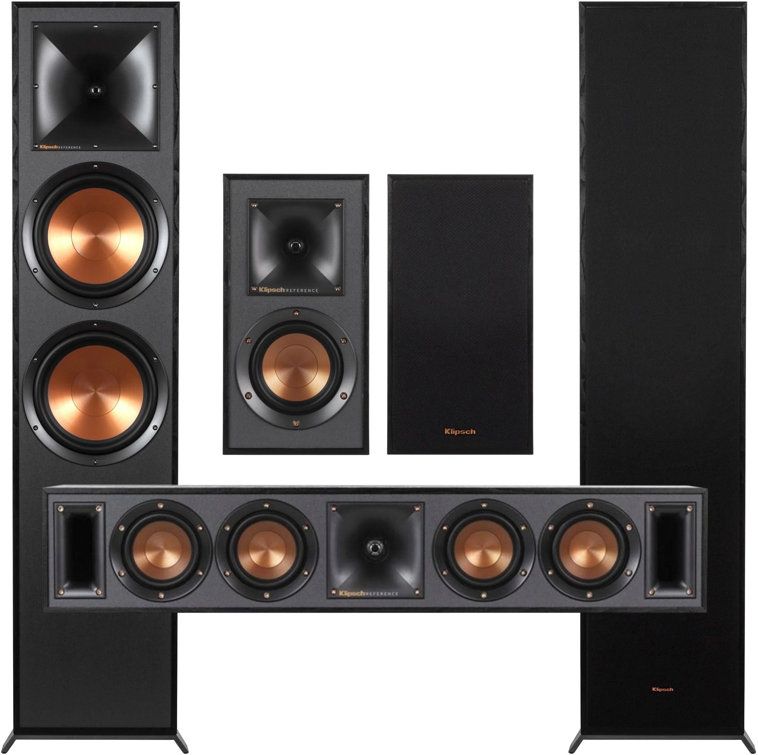 Kompletny zestaw czarnych kolumn głośnikowych marki Klipsch z serii Reference, dedykowany do systemów kina domowego 5.0. W zestawie znajdują się dwie kolumny podłogowe Klipsch R-820F, dwie kolumny podstawkowe Klipsch R-41M oraz kolumna centralna Klipsch R-34C. Produkty pochodzą z oficjalnej polskiej dystrybucji.