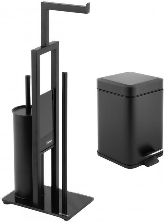 Zestaw akcesoriów do toalety, w skład którego wchodzi: 1.Stojak na papier toaletowy i szczotkę WC 3w1 2.Kosz na śmieci 3l czarny Komplet doskonale pasuje do łazienki zarówno w stylu loft jak i w stylu nowoczesnym, industrialnym bądź klasycznym. Stojak na papier toaletowy i szczotkę WC 3w1 – czarny z elementami szkła hartowanego. Elegancki stojak na zapasowy papier toaletowy wraz ze szczotką WC oraz z uchwytem na dodatkowe 4 rolki. Stojak wykonany z wysokich jakości stali - malowany proszkowo w kolorze czarnym oraz elementami szkła hartowanego. Szeroka podstawa zapewnia doskonałą stabilność. Nowoczesny kosz łazienkowy z mechanizmem opadania pokrywy tzw SOFT CLOSE Wykonany ze stali malowanej proszkowo na czarno o idealnie gładkim, matowym wykończeniu. Nowoczesna, kwadratowa forma kosza. Dzięki wygodnemu pedałowi możemy otworzyć pokrywę bez używania rąk. Wewnątrz kosza znajduje się czarny, plastikowy pojemnik, który posiada praktyczną rączkę, dzięki której łatwiej jest opróżnić kosz Podstawa całego produktu wykonana jest z tworzywa sztucznego, które nie porysuje powierzchni podłogi w łazience czy toalecie. Kosz na śmieci idealnie nadaje się zarówno do łazienki jak i do kuchni, do segregacji np. bio odpadów. Najważniejsze cechy stojaka Elegancki, czarny kolor Szkło hartowane, które nadaje oryginalnego designu 3w1 – oszczędność miejsca Wysokiej jakości wykonanie Nóżki wykonane ze specjalnej gąbki, które zapobiegają rysowaniu podłogi i zapewniają stabilność. Najważniejsze cechy kosza Wygodny pedał otwierania – nie musisz używać rąk Pokrywa z systemem wolnego opadania – gwarantuje ciche użycie Wewnętrzny pojemnik – wiaderko z uchwytem Praktyczny uchwyt z tyłu kosza ułatwiający przenoszenie i opróżnianie Podstawa wykonana z tworzywa sztucznego, dzięki czemu nie porysuje powierzchni podłogi Idealnie gładkie, matowe wykończenie Szczególnie pasuje do wnętrz wykończonych w stylu nowoczesnym, loftowym lub industrialnym Specyfikacja Marka: Yoka Home Kod produktu: P.PAULO-BLK_CH.MUTI-SC-BLK Materiał: Stal malowana proszkowo / Tworzywo sztuczne / Szkło hartowane Kolor: Czarny Kolor włosia szczotki WC: Czarny Rodzaj szczotki: Zamknięta - posiada metalową pokrywkę na pojemnik Pojemność kosza: 3 l Wymiary stojaka Wysokość całkowita: 62 cm Wysokość całkowita wraz ze szczotką od podstawy: 38 cm Długości podstawy: 23,5 cm Szerokość podstawy: 15,5 cm Wymiary kosza Wysokość całkowita: 25 cm Szerokość: 16 cm Długość: 16 cm Szerokość pedału otwierającego: 6 cm Unikalny element szklany Centralnym elementem stojaka, jak również przy podstawie jest szkło hartowane, które nie tylko dodaje elegancji, ale również stabilność i łatwą pielęgnację Wykończenie szkła nadaje produktowi nowoczesnego charakteru i harmonizuje z pozostałymi matowymi elementami stojaka Główka szczotki wykonana z PVC jest łatwa do czyszczenia i zapewnia skuteczne czyszczenie toalety, co jest niezwykle ważne dla utrzymania higieny w łazience. Górna część stojaka zapewnia wygodę użytkowania – posiada dodatkowe zabezpieczenie, które zapobiega zsunięcie się papieru. To rozwiązanie sprawia, że wymiana papieru jest szybka i bezproblemowa, a sama rolka zawsze pozostaje na swoim miejscu, nawet przy intensywnym użytkowaniu. Stojak zawiera uchwyt na papier uchwyt na zapas aż 4 rolek szczotkę do WC z czarną główką wyciągany pojemnik szczotki umożliwiający łatwe i szybkie czyszczenie ściankę i podstawę stojaka wykonaną ze szkła hartowanego ⋆ Stojak przeznaczony do samodzielnego zmontowania, oryginalnie zapakowany w karton. W opakowaniu znajdują się wszystkie niezbędne elementy potrzebne do zmontowania stojaka WC.