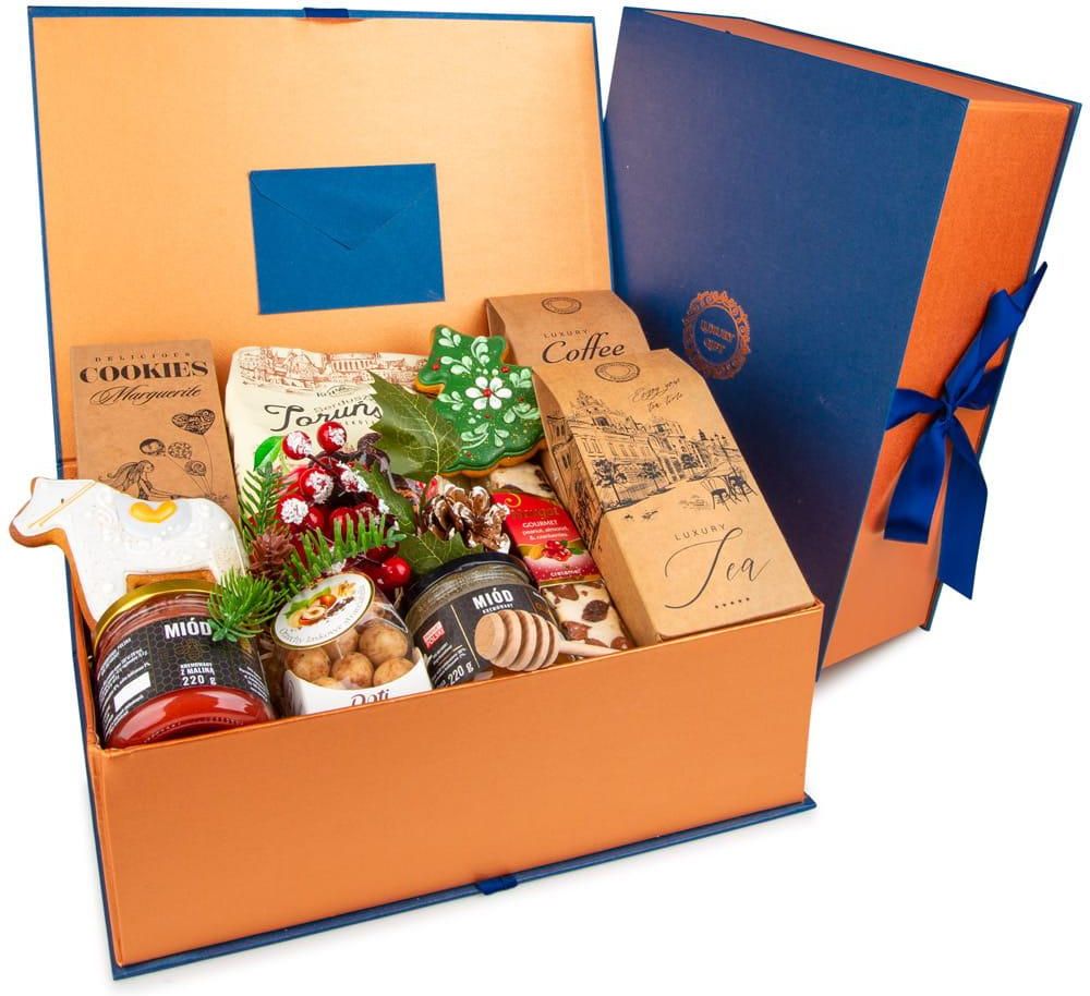 Zestaw prezentowy na święta KSX355 Uczta smaków Serduszka toruńskie w czekoladzie z nadzieniem o smaku wiśniowym 150g Kawa mielona Arabica 100%, 100g Czarna japońska herbata liściasta, płatki róży 80g Miód kremowany z pomarańczą liofilizowaną w słoiku 220g Miód kremowany z maliną w słoiku 220g Chrupiące orzechy laskowe w czekoladzie straciatella 100g Nugat miękki orzeszki ziemne i żurawina 100g Lukrowany ręcznie dekorowany piernik w kształcie świątecznej choinki Drewniany nabierak do miodu Lukrowany ręcznie dekorowany piernik w kształcie konika Ciastka kruche z nadzieniem wiśniowym Margaretka 135g Ozdobne pudełko granatowo- miedziane z kopertą Ozdoba świąteczna Celofan z kokardką Prezentowany zestaw jest również możliwy do kupienia, w niewielkich ilościach, osobiście w Warszawie na ulicy Marywilskiej 38 w siedzibie firmy Fabulosa. Zapraszamy do kontaktu telefonicznego w razie pytań.