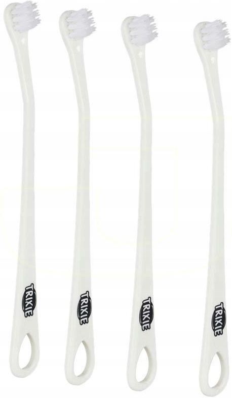 Trixie Zestaw Szczotek do zębów 4 szt. to zestaw 4 szczoteczek do zębów, większa część przeznaczona do przednich zębów, mniejsza do zębów z tyłu. Trixie Zestaw Szczotek do zębów 4 szt. Regularne dbanie o higienę jamy ustnej psa skutecznie zapobiega powstawaniu kamienia nazębnego i związanych z nim chorób przyzębia i jamy ustnej.Psa do mycia zębów należy przyzwyczajać stopniowo. Zaczynamy od pasty na np. zabawce, następnie próbujemy czyścić zęby palcem.Gdy pies jest przyzwyczajony do zabiegów pielęgnacyjnych w obrębie jamy ustnej, na koniec wprowadzamy szczoteczkę do zębów.Zalety: dwustronna mała szczoteczka do zębów trzonowych duża szczoteczka do zębów przednich długa rączka ułatwia dojście na najdalszych zębów trzonowych w zestawie 4 sztuki