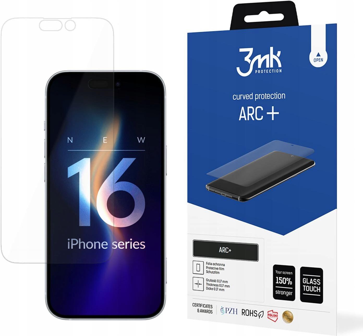 3mk ARC+ Najlepsza folia ochronna na zaokrąglony ekran dopasowana do modelu Apple iPhone 16 Plus, doskonale przylega do wyświetlacza dzięki montażowi Semi-Wet, wzmacnia ekran o 150%, powłoka Self-Heal™ samoregeneruje powstałe zarysowania, tylko 0,17 mm grubości, idealnie odzworowane barwy i …