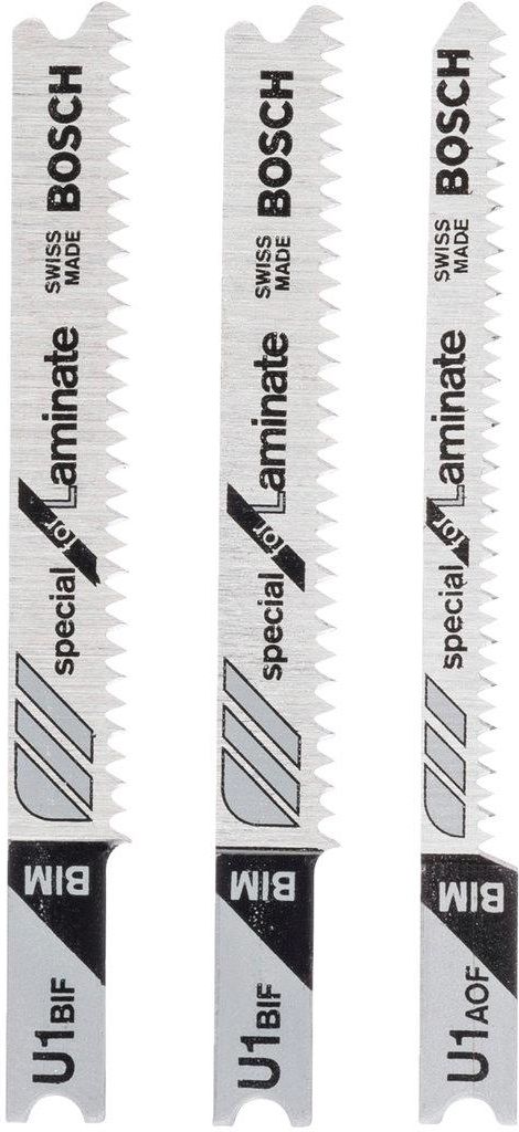 BOSCH Brzeszczoty uniwersalne do wyrzynarek U1AOF/U1BIF - 3 szt. Zestaw brzeszczotów do wyrzynarki Bosch Special for Laminate zapewnia czyste i proste cięcia w drewnie oraz płytach laminowanych tworzywem sztucznym. Najwyższa jakość wykonania, produkowane w Szwajcarii. Kompatybilne z wyrzynarkami wszystkich marek posiadających uchwyt uniwersalny "U". 1 x brzeszczot U 1 AOF Special for Laminate 2 x brzeszczoty U 1 BIF Special for Laminate Mocowanie: uchwyt "U" Materiał: BIM (bi-metal) Długość: 70 mm